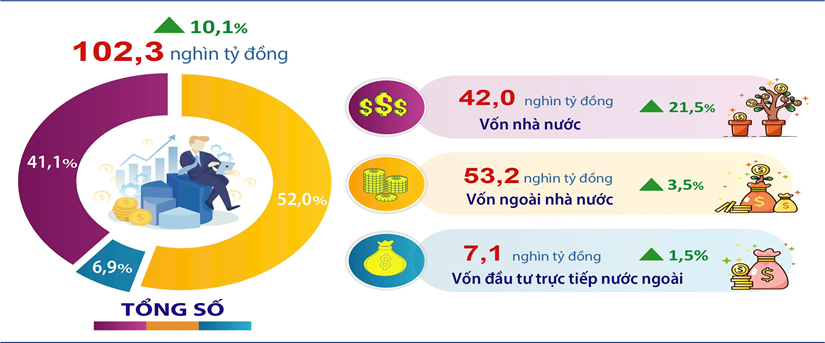 Trong đó, vốn nhà nước đạt 42,0 nghìn tỷ đồng, chiếm 41,1% tổng vốn đầu tư, tăng 21,5%; vốn ngoài nhà nước đạt 53,2 nghìn tỷ đồng, chiếm 52,0%, tăng 3,5%; vốn đầu tư trực tiếp nước ngoài đạt 7,1 nghìn tỷ đồng, chiếm 6,9%, tăng 1,5%.