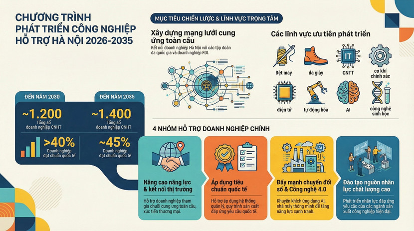 Infographic: Hà Nội đặt mục tiêu 1.400 doanh nghiệp công nghiệp hỗ trợ tham gia chuỗi cung ứng toàn cầu