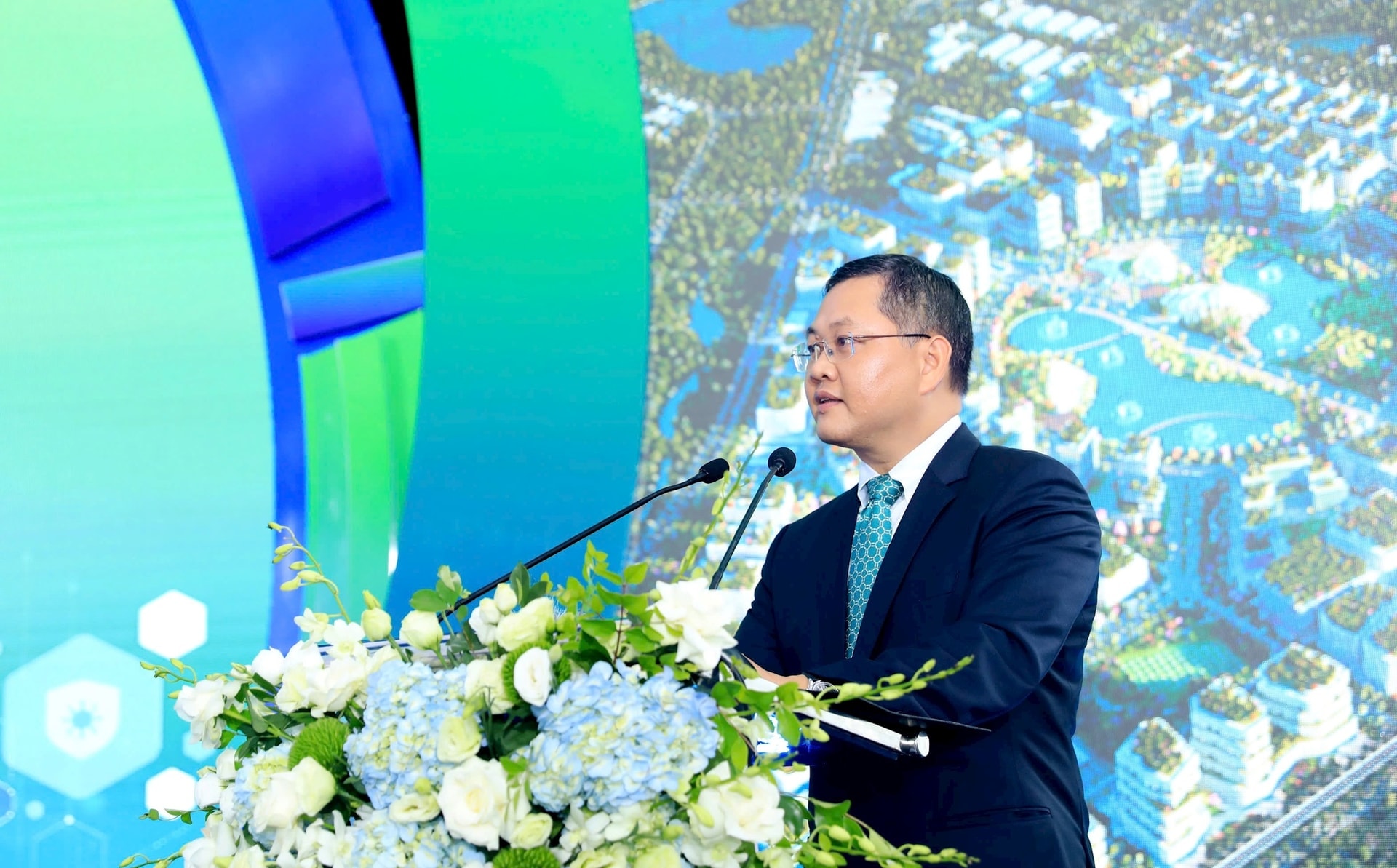 Trưởng Ban Quản lý Khu công nghệ cao và Khu công nghiệp Hà Nội Vũ Xuân Hùng phát biểu tại Lễ khởi công dự án Khu công nghệ cao sinh học Hà Nội. Ảnh: Nguyên Anh