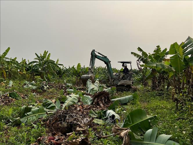 Lực lượng thi công tiến hành tháo dỡ, dọn dẹp cây cối trên diện tích đất đã được người dân bàn giao để giải phóng mặt bằng. Ảnh: Kim Anh/TTXVN