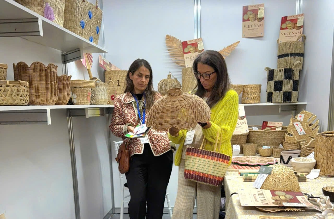 Khách tham quan gian hàng sản phẩm thủ công mỹ nghệ, làng nghề, sản phẩm OCOP của Hà Nội. Ảnh: Minh Huệ