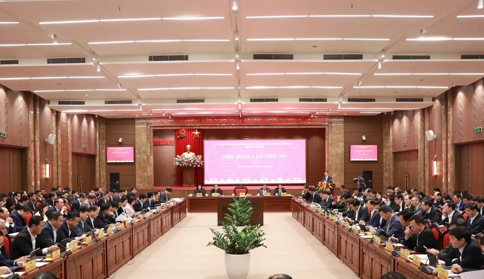 Bí thư Thành ủy Hà Nội Nguyễn Duy Ngọc cùng các đồng chí lãnh đạo TP chủ trì hội nghị.