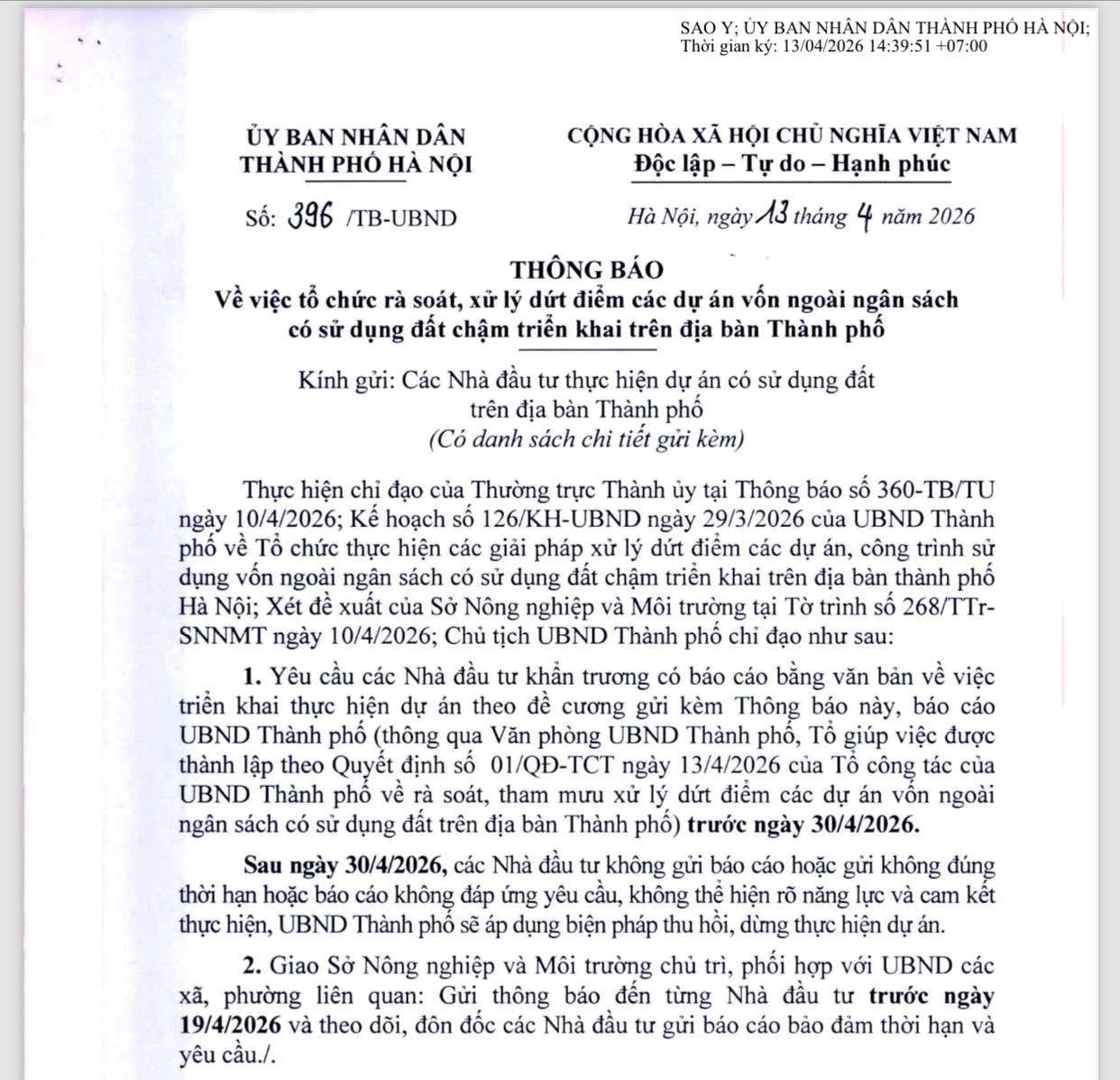 UBND TP.Hà Nội vừa ban hành Thông báo số 396/TB-UBND ngày 13/4/2026 về việc tổ chức rà soát, xử lý dứt điểm các dự án vốn ngoài ngân sách có sử dụng đất chậm triển khai trên địa bàn TP.