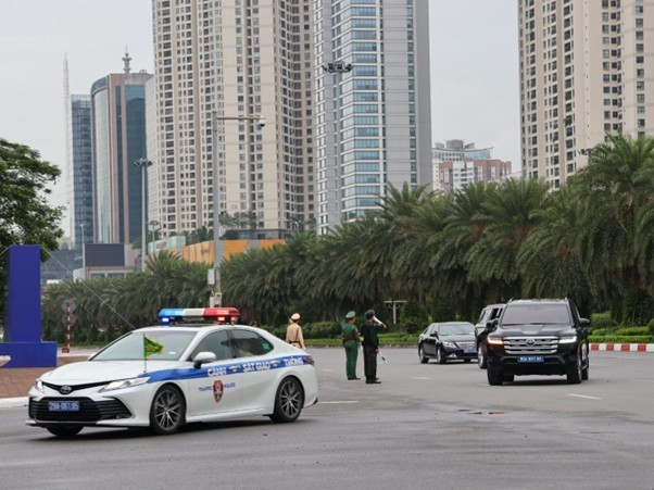 Đội Cảnh sát tuần tra dẫn đoàn, Phòng Cảnh sát Giao thông Công an Thành phố Hà Nội hướng dẫn các đoàn bên trong Trung tâm hội nghị Quốc gia.(Ảnh:PV/Vietnam+)