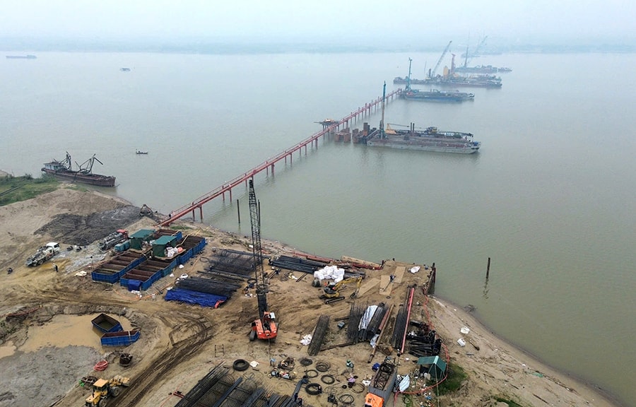 Công trường thi công cầu Hồng Hà thuộc Dự án đầu tư xây dựng đường Vành đai 4 - Vùng Thủ đô Hà Nội. Ảnh: Quang Thái
