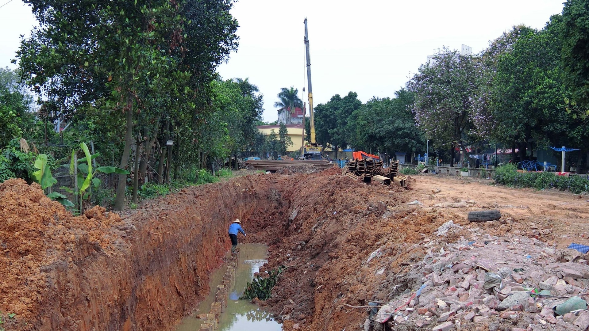 Đoạn kênh đang được thi công nạo vét và đóng cọc tre tại khu vực phường Đông Ngạc.