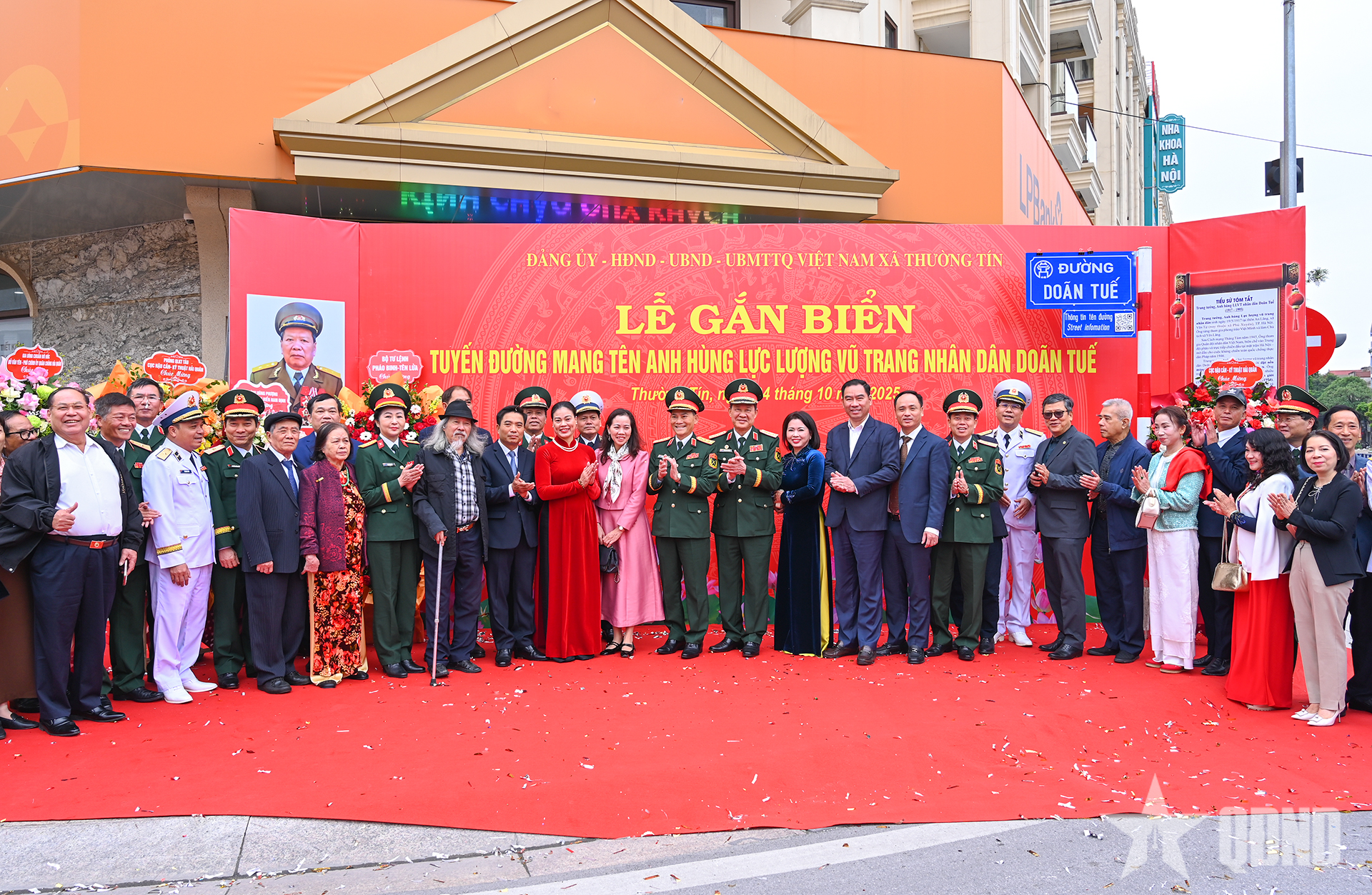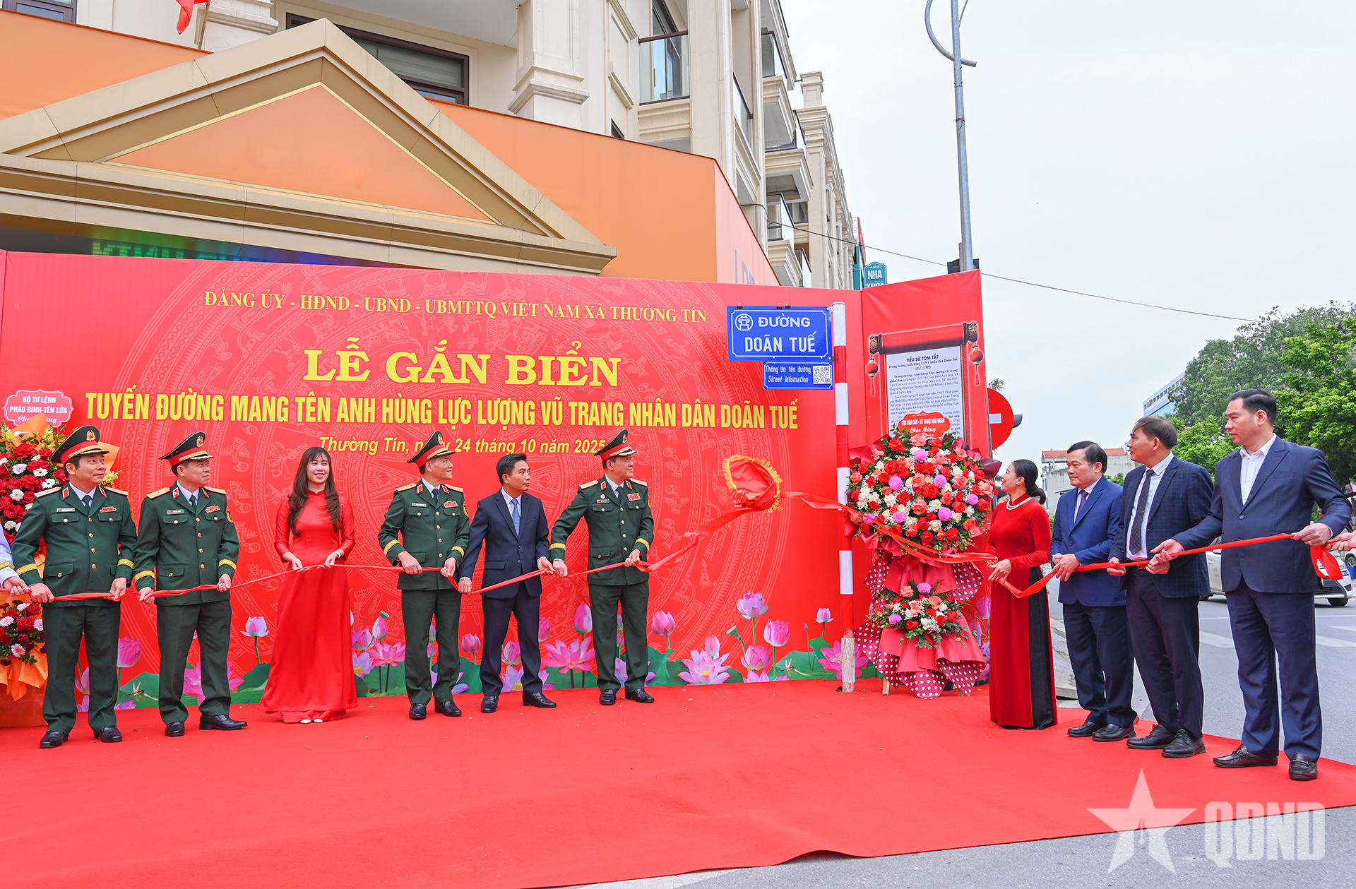 Các đại biểu thực hiện nghi thức kéo băng gắn biển tuyến đường mang tên Trung tướng, Anh hùng LLVT nhân dân Doãn Tuế tại xã Thường Tín (TP Hà Nội).