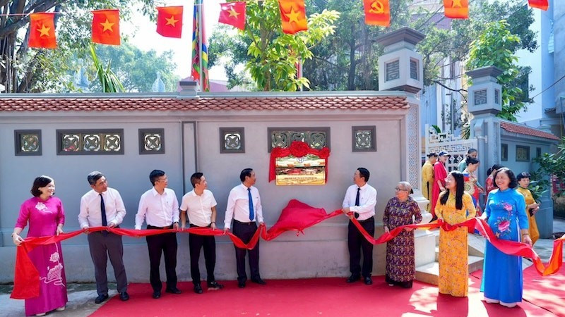 Các đại biểu thực hiện nghi thức gắn biển"Dân vận khéo" tại đình Đại Yên, phường Ngọc Hà.