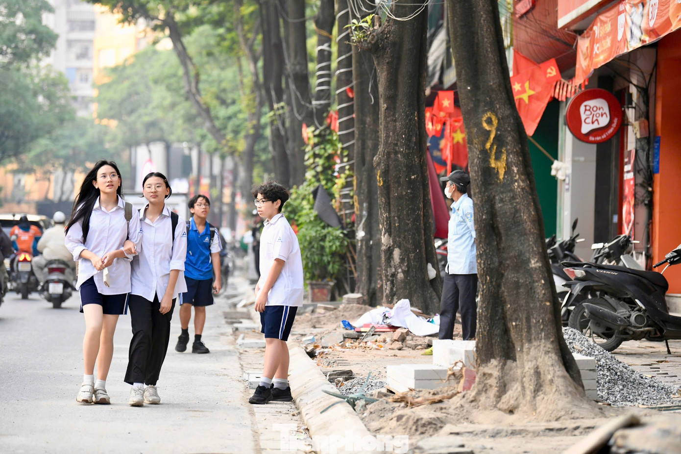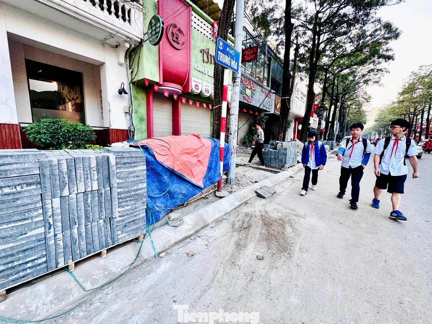 Giờ tan học trên phố Trung Hòa, học sinh phải xuống lòng đường đi bộ do vỉa hè đang thi công, tiềm ẩn nhiều rủi ro mất an toàn.