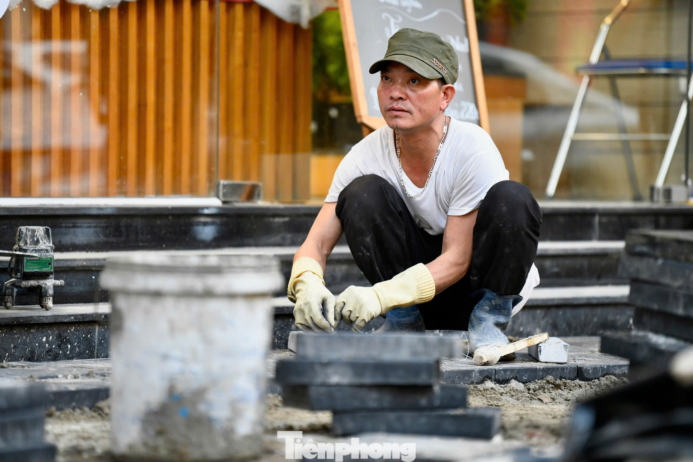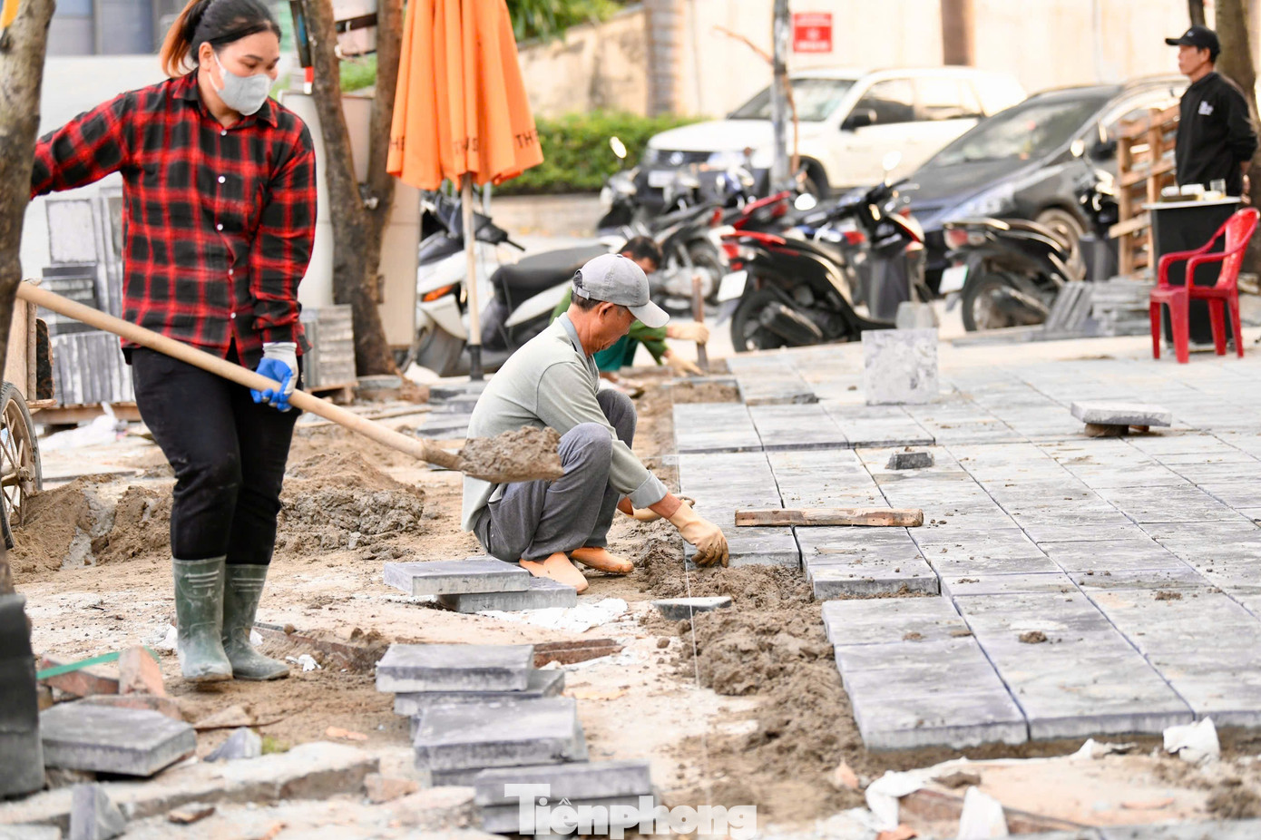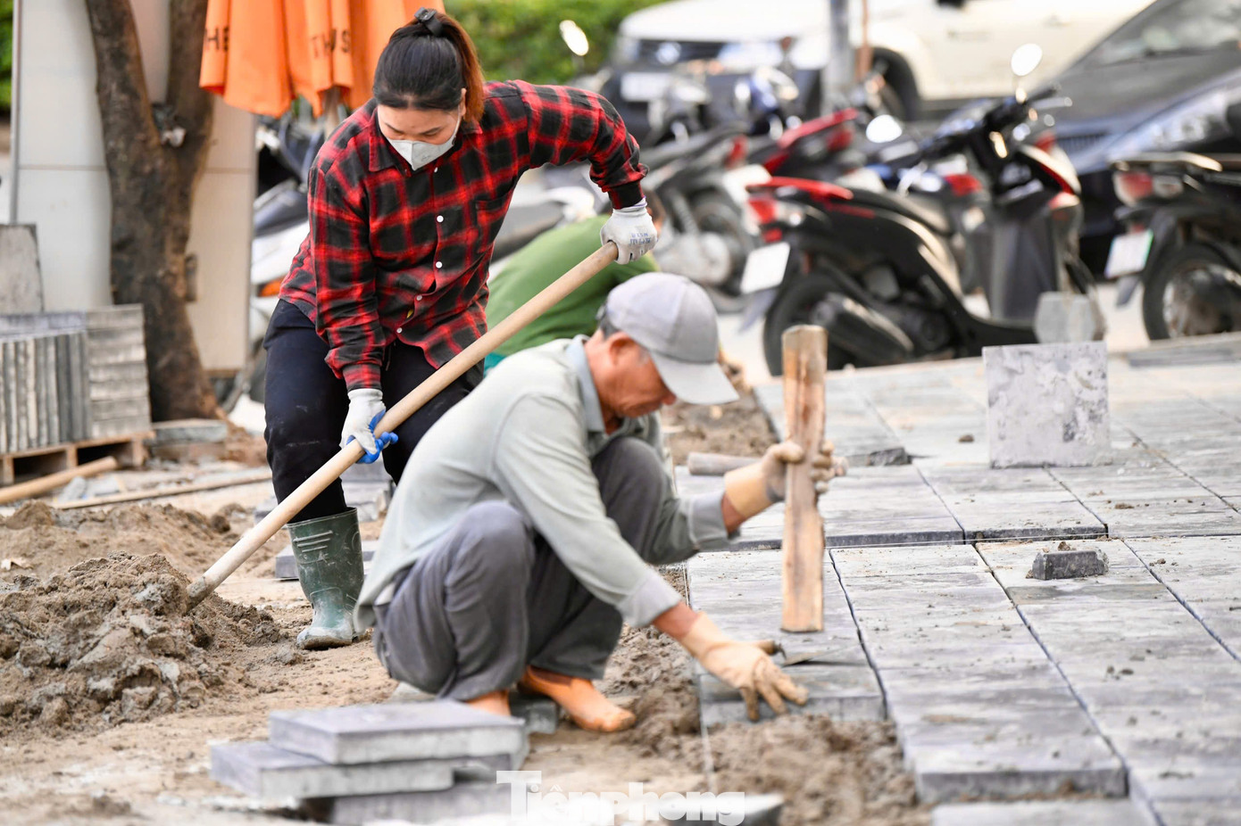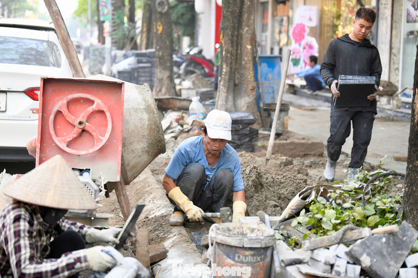 Trên nhiều tuyến phố, công nhân khẩn trương thi công, “khoác áo mới” cho vỉa hè. Hình ảnh trên phố Trung Hòa.