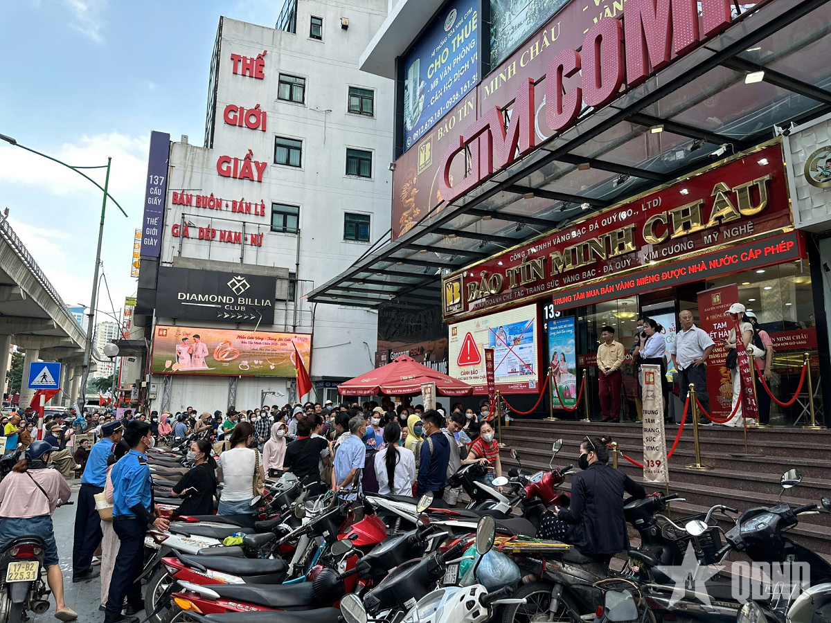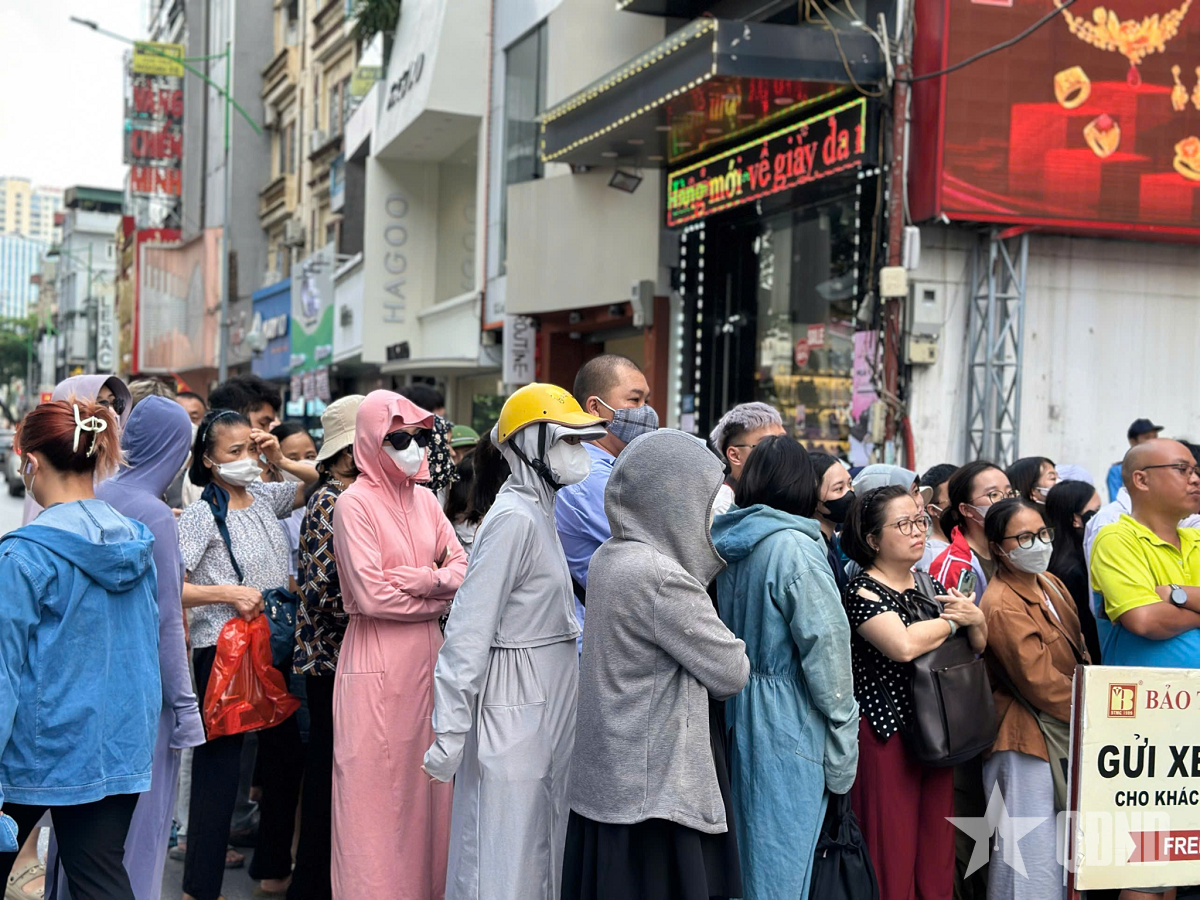 Người dân xếp hàng dài trước cửa hàng Bảo Tín Minh Châu (193 Cầu Giấy, Hà Nội) trong chiều 17-10.