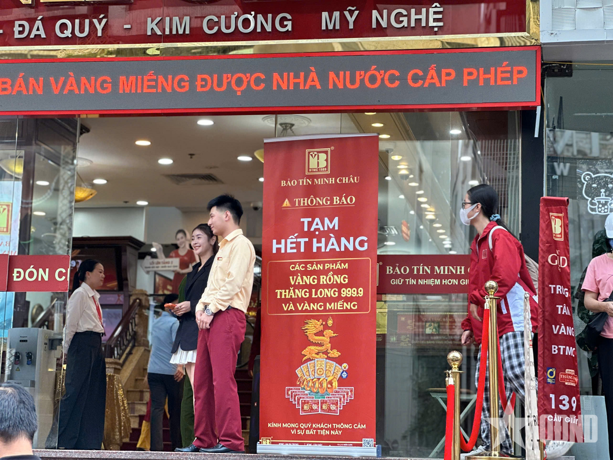 Bảng thông báo “Tạm hết hàng” đặt ngay lối vào, cho biết các sản phẩm vàng miếng và vàng Rồng Thăng Long 9999 đã được bán hết do nhu cầu tăng cao.