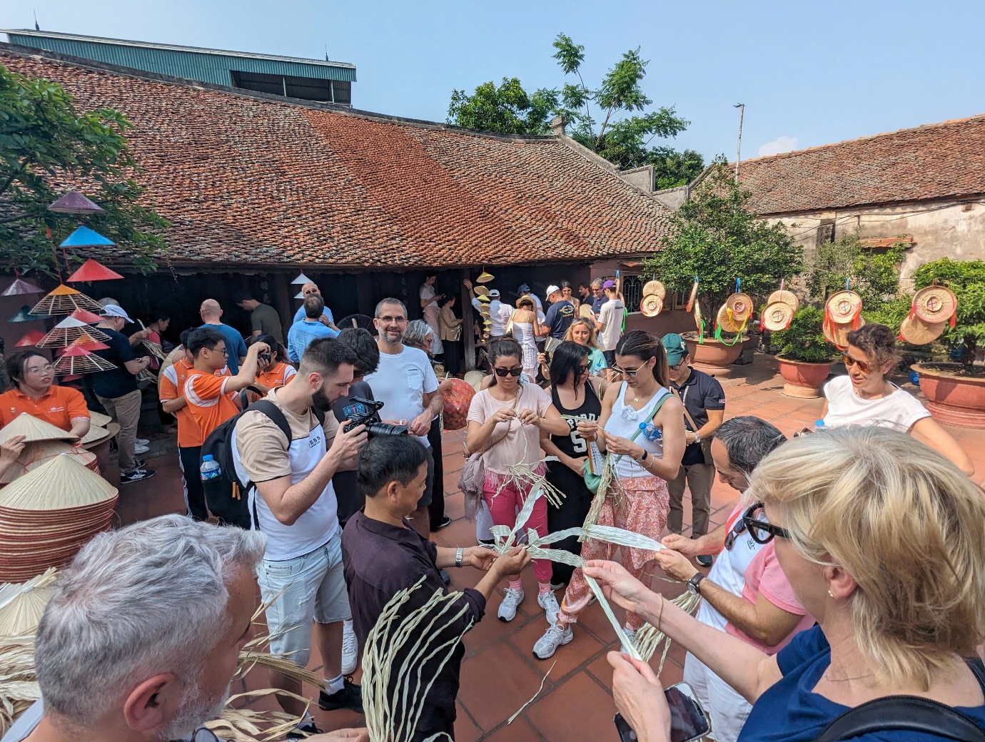 Du khách nước ngoài thích thú tìm hiểu về chiếc nón lá truyền thống của người dân làng Chuông.
