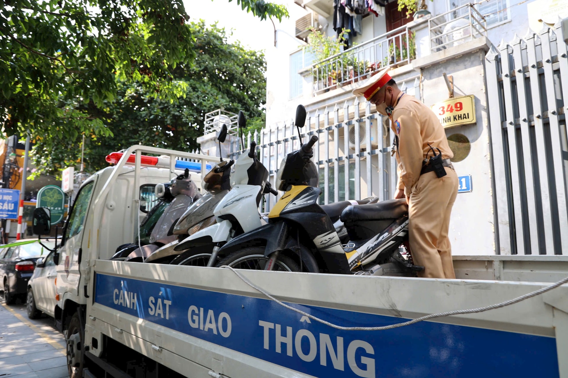 Tại phố Minh Khai, Đội Cảnh sát giao thông đường bộ số 4 phát hiện 6 trường hợp vi phạm, tạm giữ 6 phương tiện. Ảnh: TT