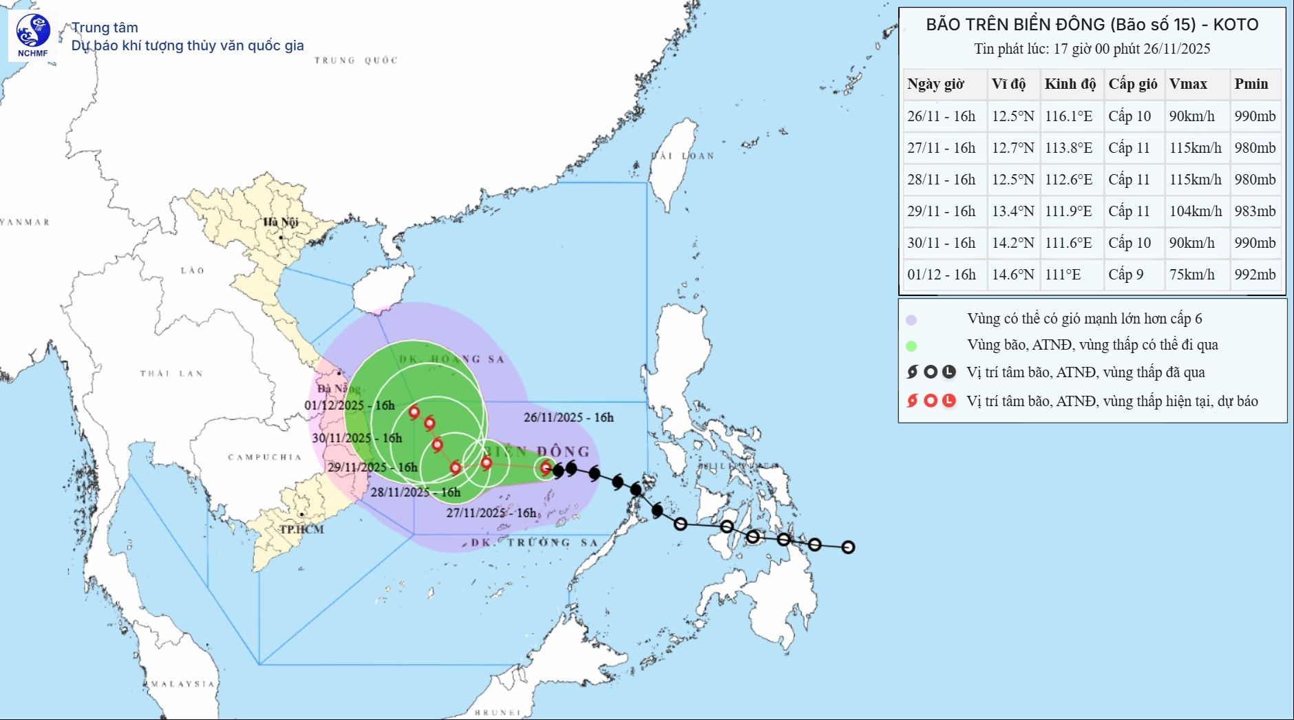 Về diễn biến bão số 15, Trung tâm Dự báo khí tượng thủy văn quốc gia cho biết, 16h ngày 26-11, tâm bão cách đảo Song Tử Tây khoảng 230km về phía Đông Bắc. Sức gió vùng gần tâm bão mạnh cấp 10 (89-102km/h), giật cấp 13. Hiện bão di chuyển theo hướng Tây Tây Bắc với tốc độ khoảng 20km/h.