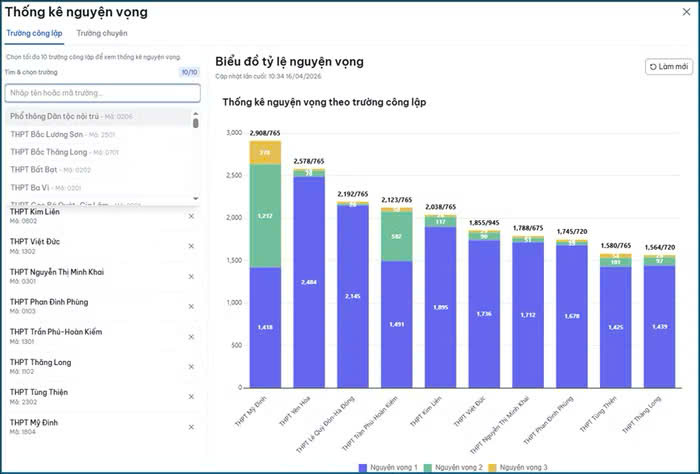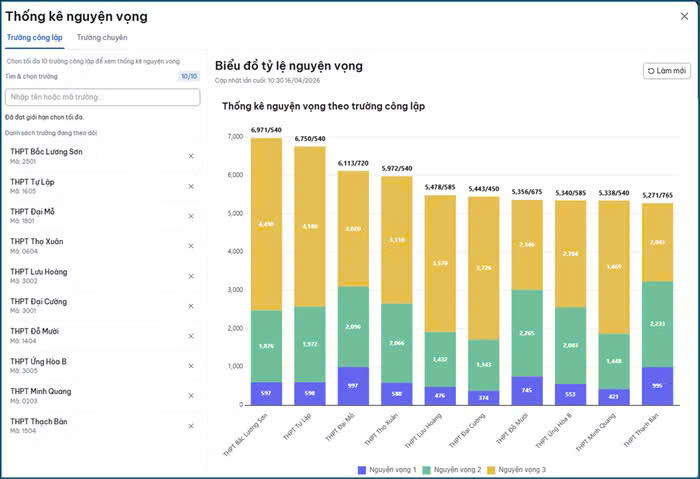 Từ số liệu này, tính theo tổng ba nguyện vọng, tốp 10 trường THPT công lập không chuyên có lượng đăng ký cao nhất gồm: THPT Bắc Lương Sơn (6.971), THPT Tự Lập (6.750), THPT Đại Mỗ (6.114). Tiếp đến là THPT Thọ Xuân (5.973), THPT Lưu Hoàng (5.476), THPT Đại Cường (5.442), THPT Đỗ Mười (5.355), THPT Ứng Hòa B (5.339), THPT Quang Minh (5.335) và THPT Thạch Bàn (5.269).