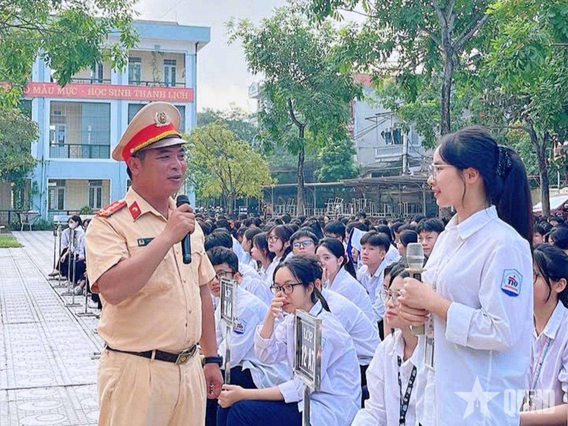 Đại úy Đỗ Văn Tuấn, cán bộ Đội CSGT đường bộ số 10 giải đáp các nội dung được học sinh quan tâm.
