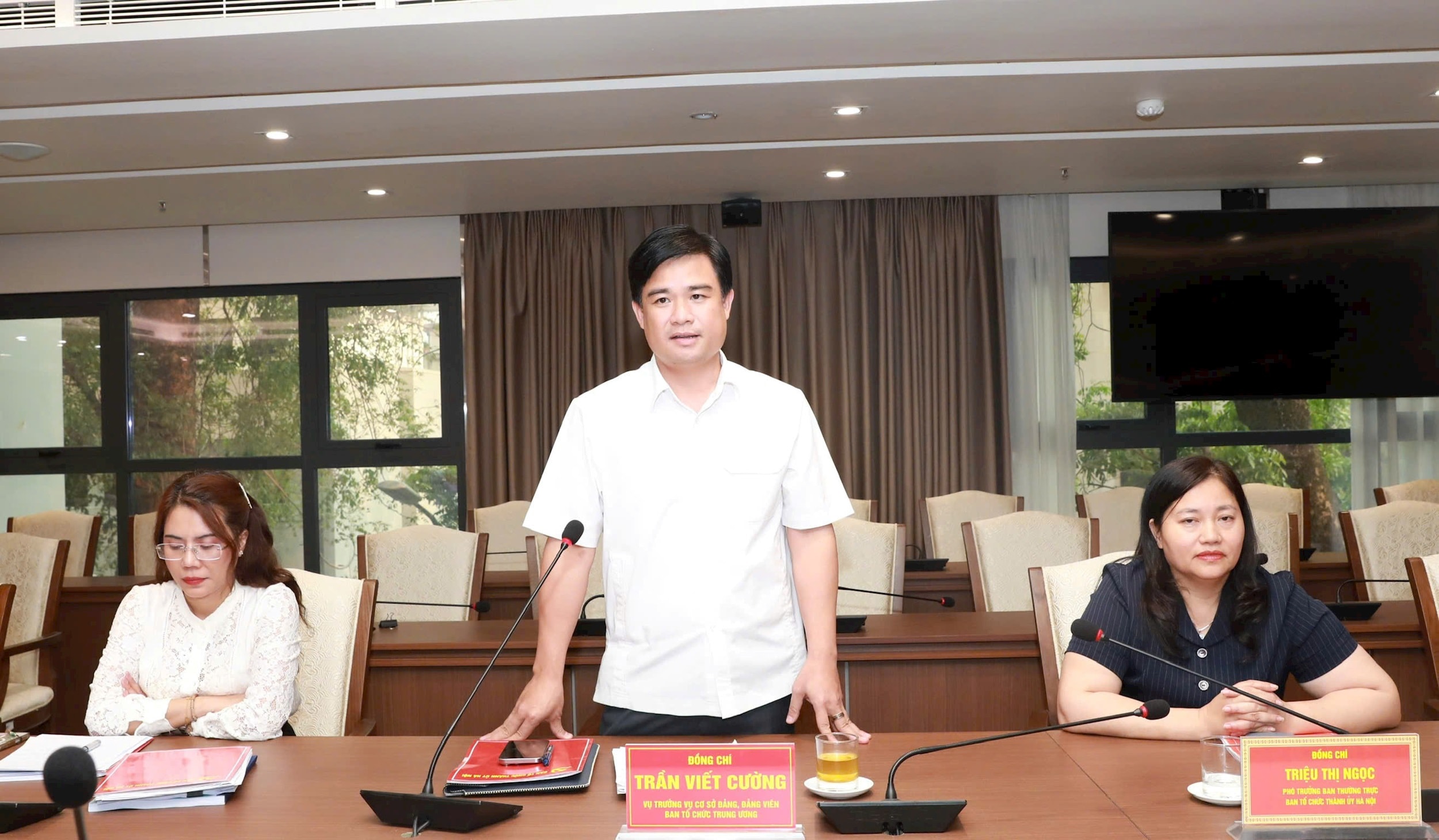 Vụ trưởng Vụ cơ sở đảng, đảng viên (Ban Tổ chức Trung ương) Trần Viết Cường và Phó Trưởng ban Thường trực Ban Tổ chức Thành ủy Hà Nội Triệu Thị Ngọc chủ trì hội nghị.