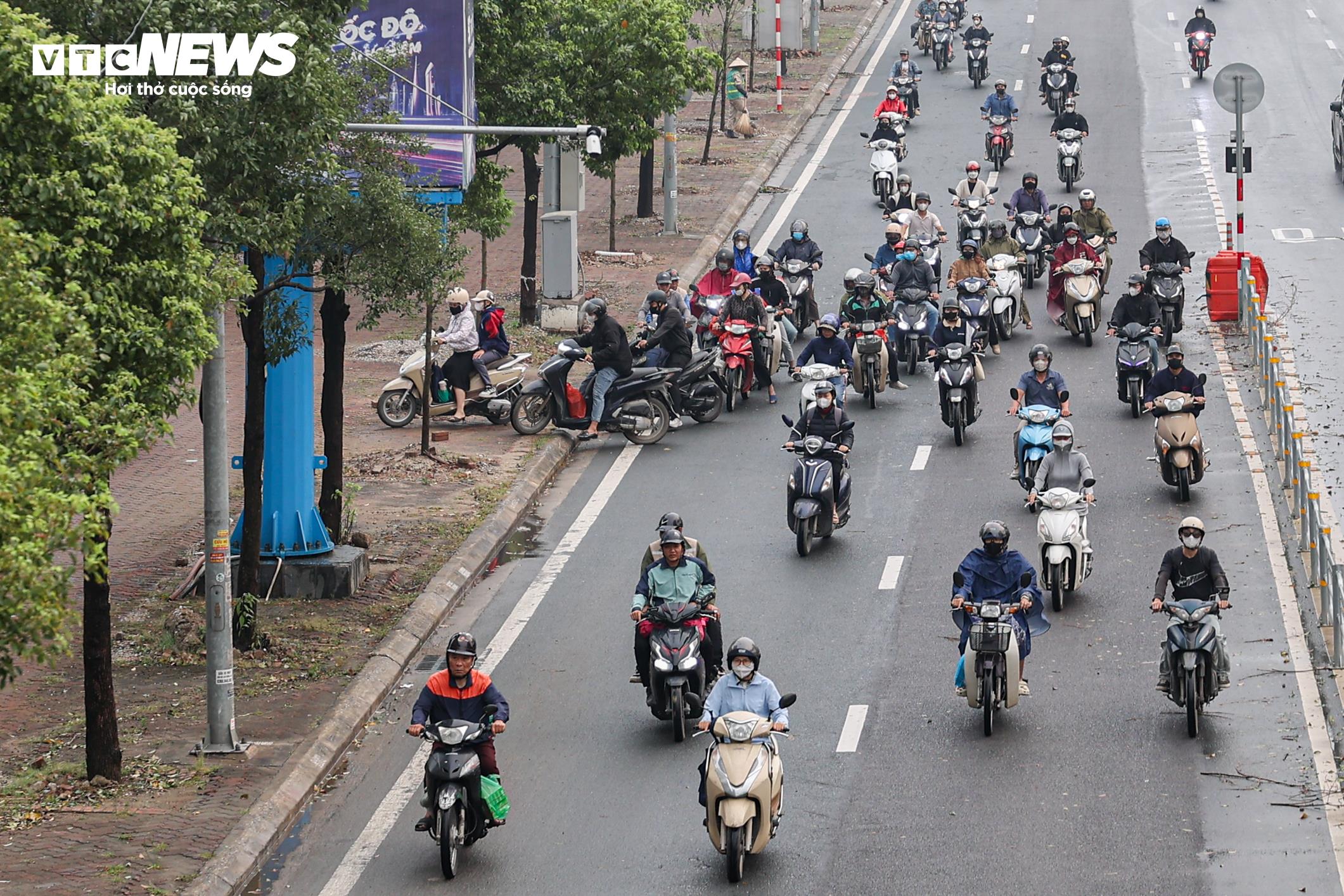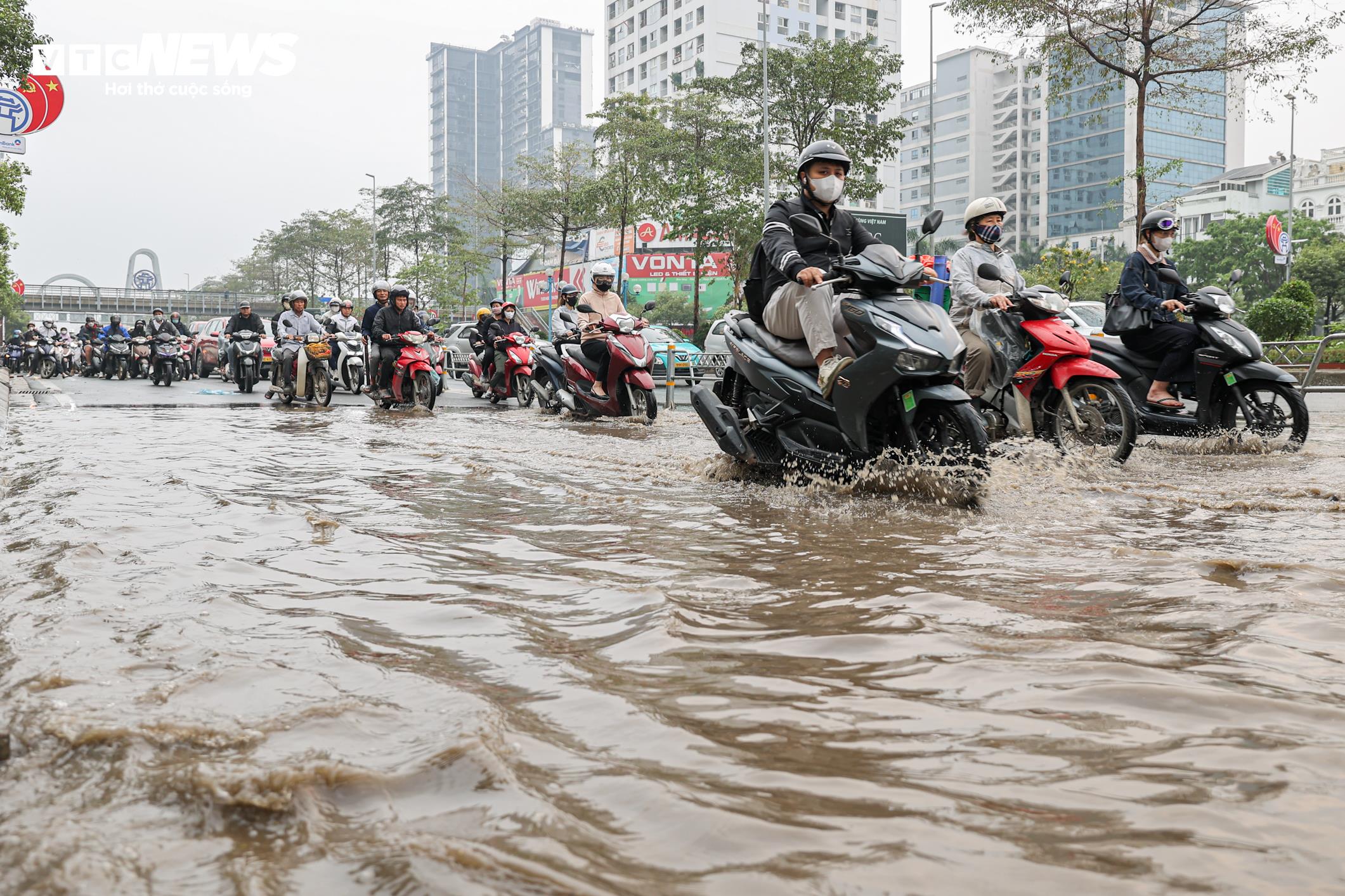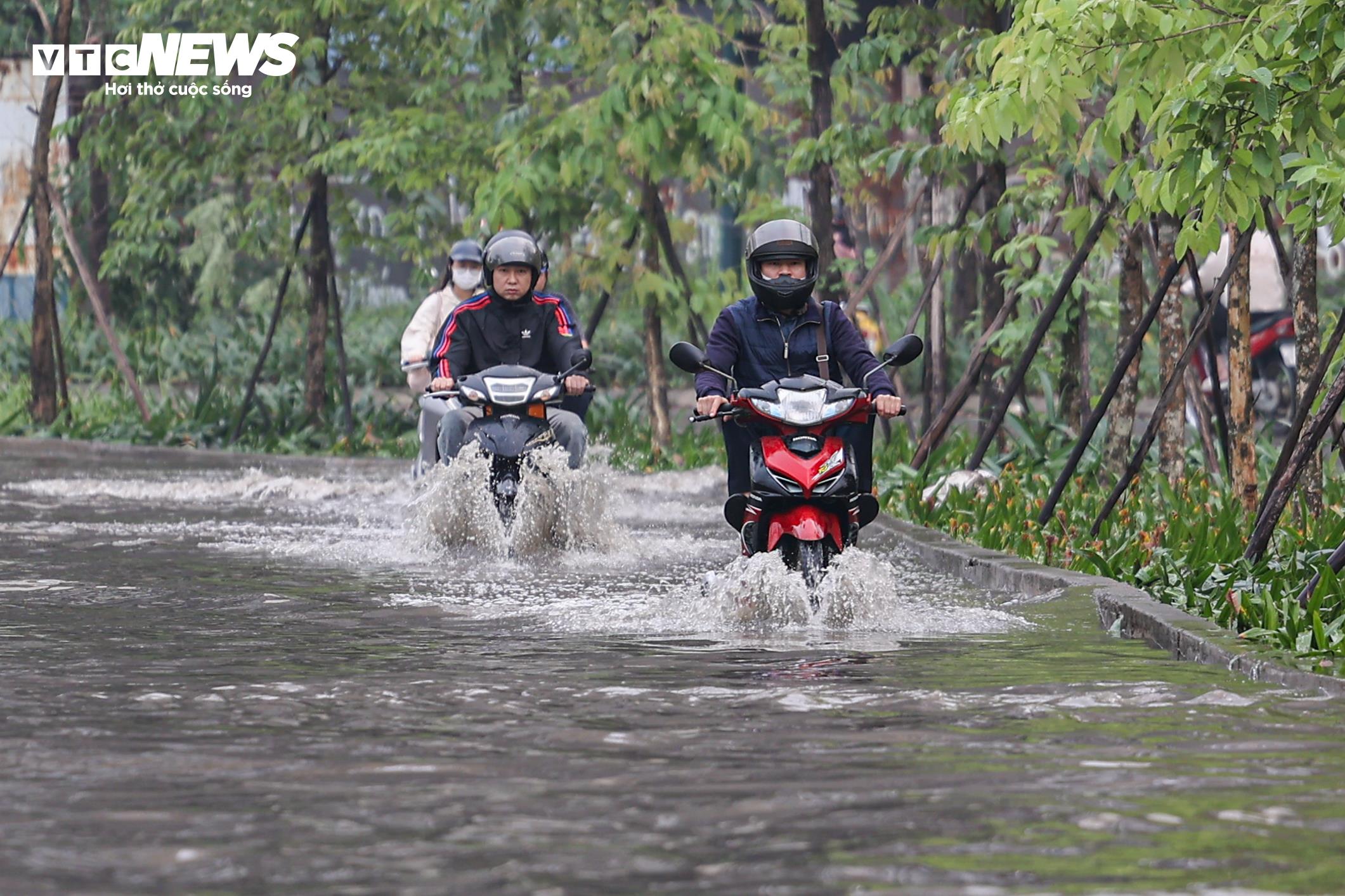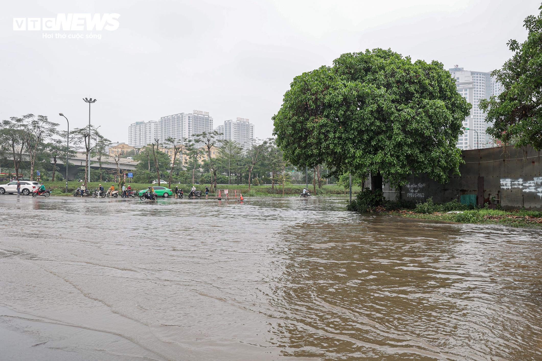 Theo ghi nhận của phóng viên Báo điện tử VTC News, tại lối xuống cầu Nhật Tân theo hướng Võ Chí Công, một đoạn đường bị ngập úng với mực nước khoảng 20-30 cm, khiến việc di chuyển của xe máy gặp khó khăn.
