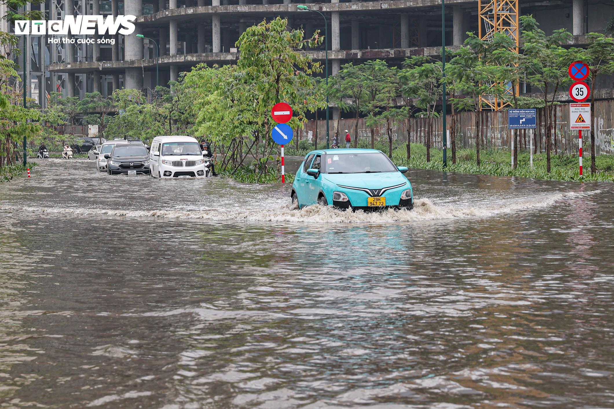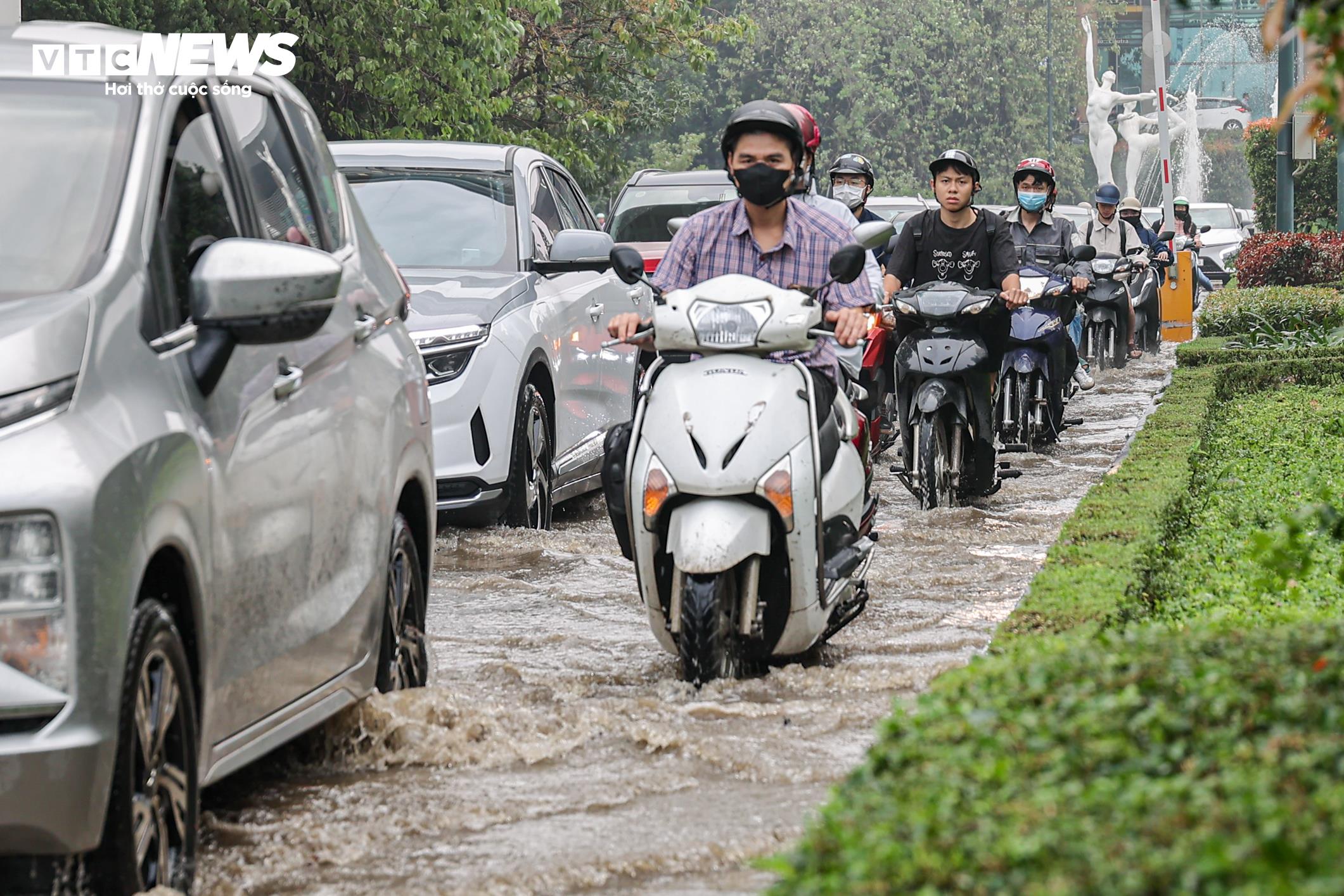 Nhiều tuyến đường nội khu trong khu đô thị Ciputra ngập sâu, ảnh hưởng đến việc đi lại của người dân.