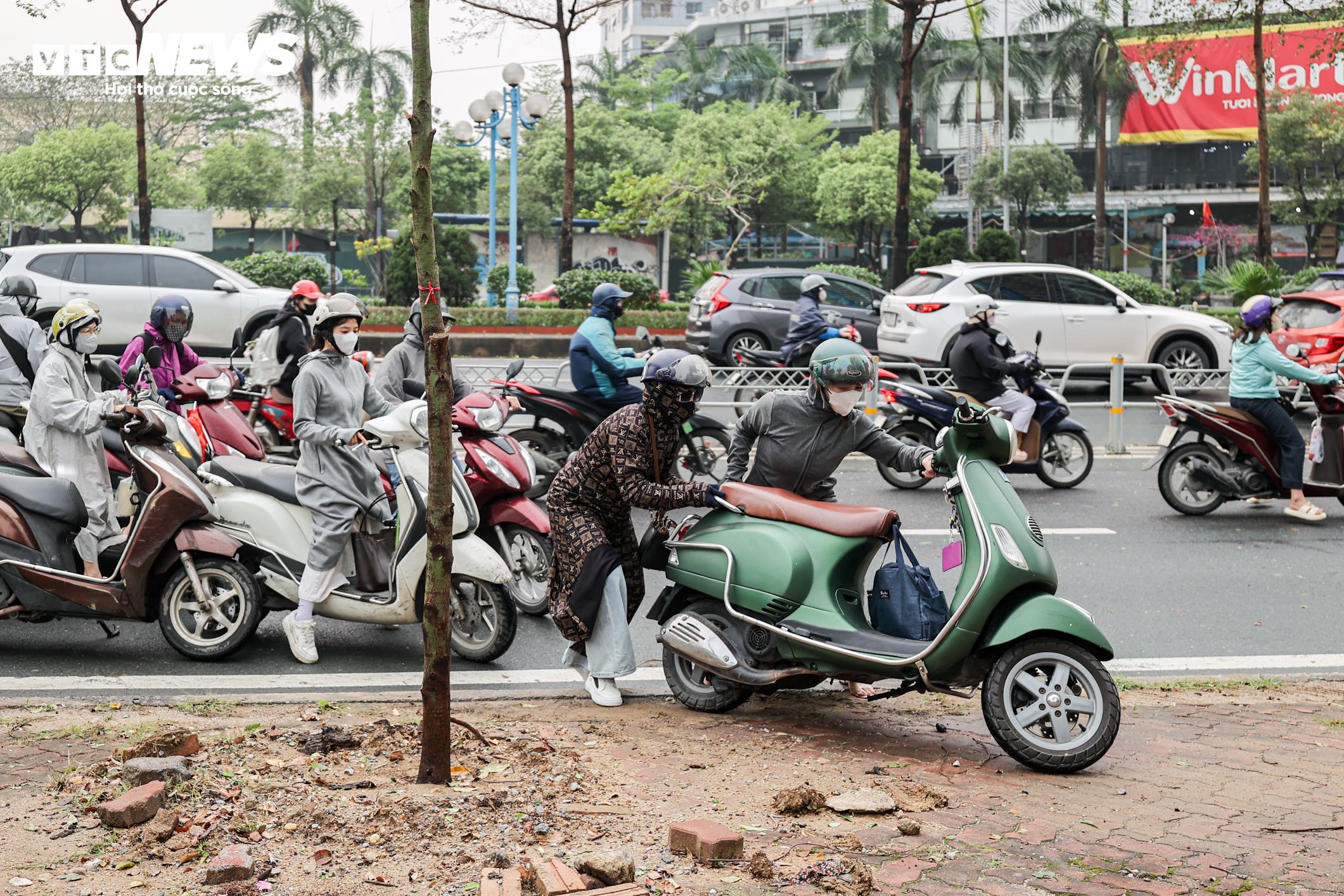 Nhiều người dân phải dắt xe lên vỉa hè để vượt qua các đoạn đường bị ngập.