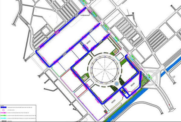 Theo sơ đồ, các phương tiện đi từ hướng cầu Đông Trù sẽ di chuyển theo tuyến Trường Sa, rẽ trái tại nút giao với đường nội bộ A2.11, tiếp tục lưu thông theo đường D2.1 để vào bãi đỗ xe P1 hoặc đi theo tuyến D2.2 để tiếp cận các bãi P5, P6.