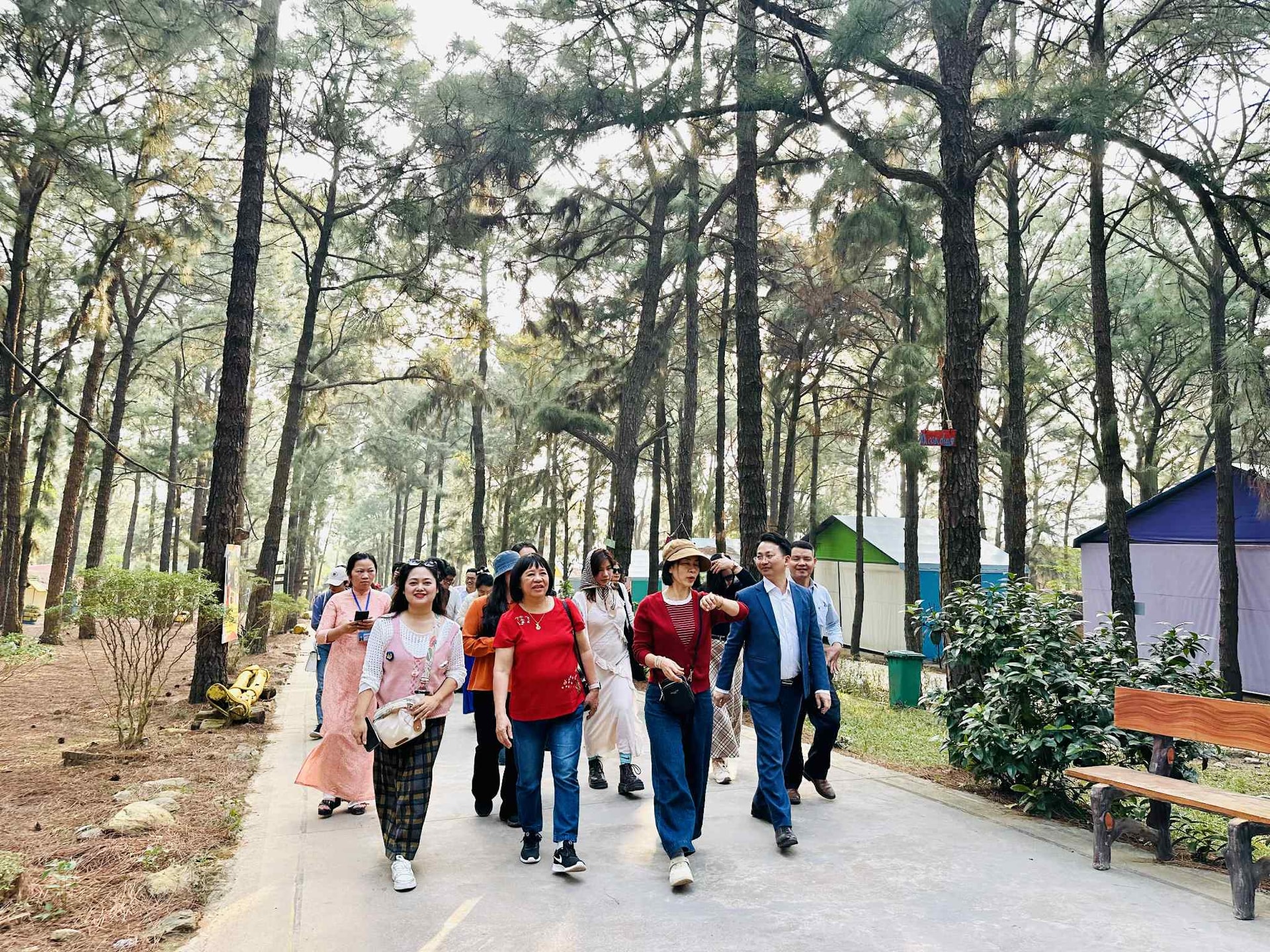 Đoàn khảo sát của Sở Du lịch Hà Nội và các đơn vị lữ hành tham quan không gian rừng thông tại KDL Thiên Phú Lâm, xã Kim Anh. Ảnh: Hoàng Lân