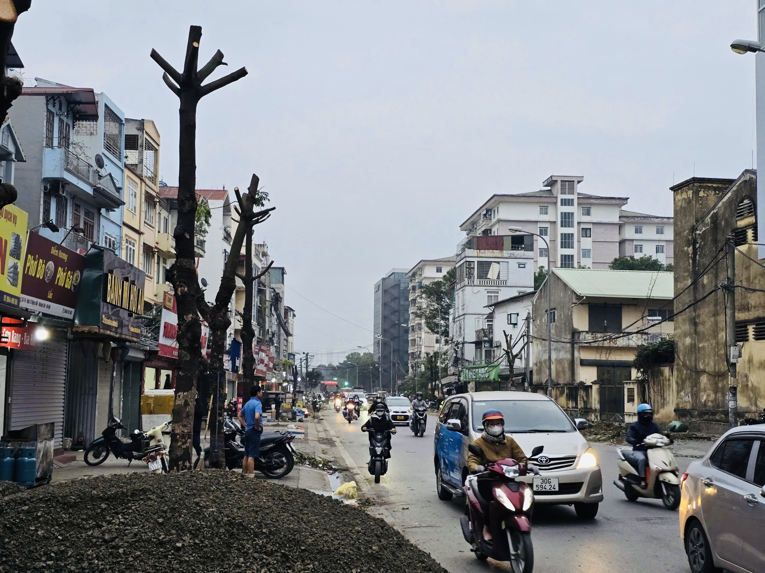 Tại ngõ 15 Ngọc Hồi, một trong những điểm nóng ùn tắc, sáng 23/12, nhiều cây xanh được đốn hạ hoặc đánh chuyển nhằm nhường diện tích mở rộng mặt đường và vỉa hè.