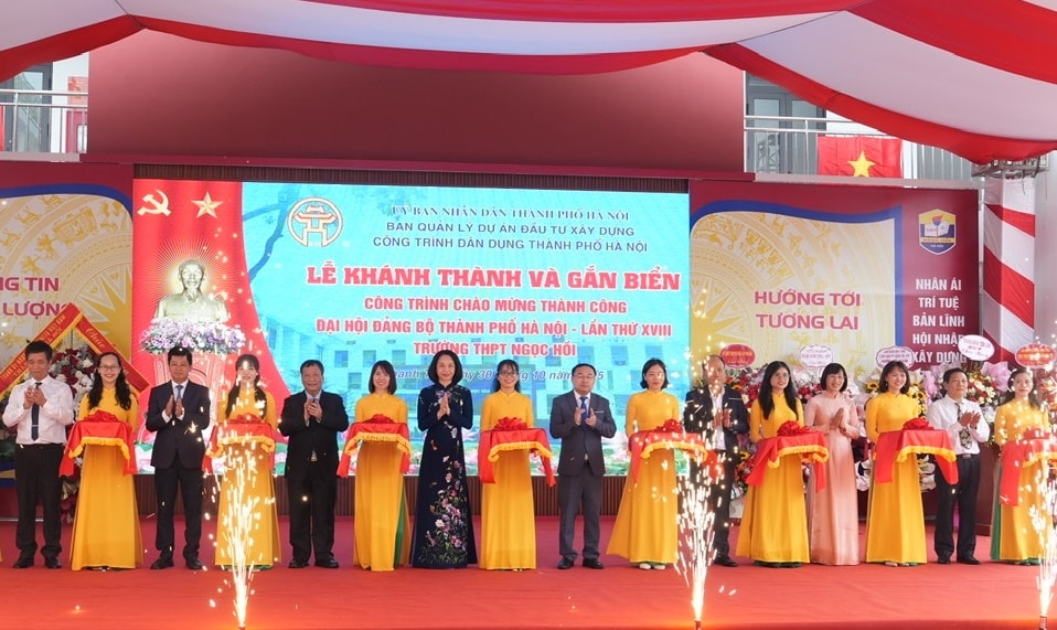 Phó Chủ tịch UBND thành phố Hà Nội Vũ Thu Hà cùng các đại biểu cắt băng khánh thành Trường THPT Ngọc Hồi. Ảnh: V.T