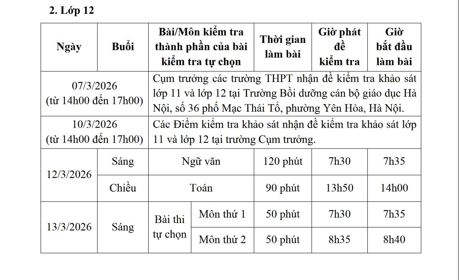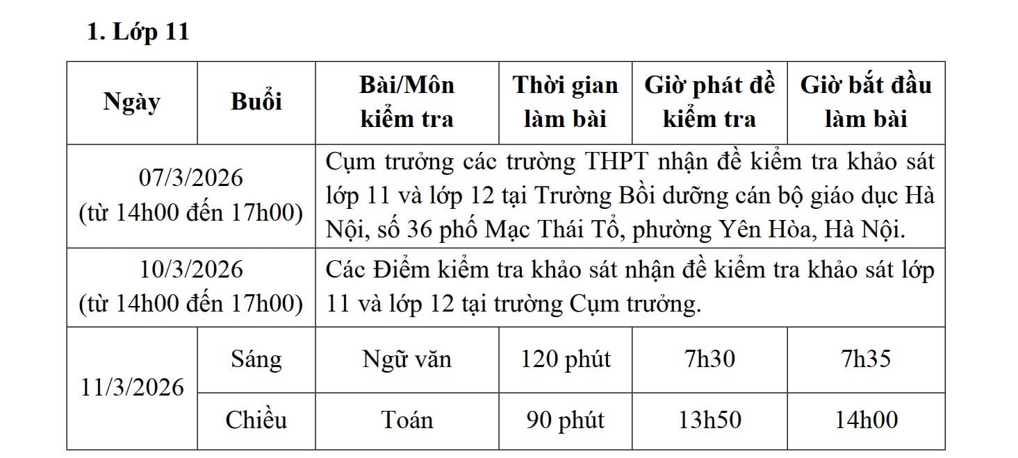 Theo kế hoạch, học sinh lớp 11 làm bài kiểm tra hai môn ngữ văn và toán. Cấu trúc đề kiểm tra thực hiện theo quy định về cấu trúc, định dạng đề thi kỳ thi tốt nghiệp trung học phổ thông áp dụng từ năm 2025 của Bộ Giáo dục và Đào tạo.