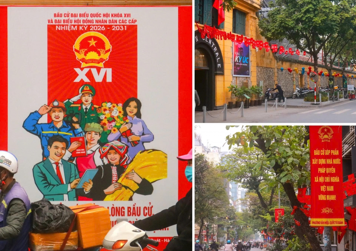 Không chỉ là mùa xuân hoa nở, khắp phố phường Hà Nội đang rộn ràng đón chào mùa xuân mới của đất nước, Ngày bầu cử đại biểu Quốc hội và đại biểu Hội đồng nhân dân các cấp. Giữa sắc hoa rực rỡ tháng ba, không khí Thủ đô càng nhộn nhịp hơn với các băng rôn, khẩu hiệu hướng tới ngày bầu cử, ngày hội của toàn dân (Ảnh: Cờ hoa, áp phích, khẩu hiệu tuyên truyền được treo khắp các con phố).