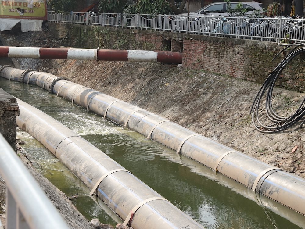 Một đoạn sông Tô Lịch đã được lắp thiết bị, nước sông đã chuyển dần sang màu xanh (Ảnh sáng 19/12)