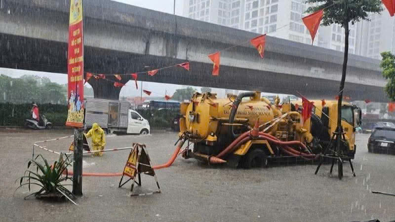 Công ty Thoát nước Hà Nội huy động phương tiện ứng trực tại các điểm ngập úng