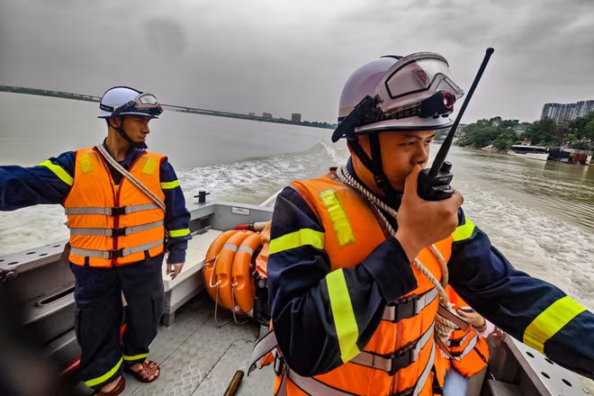 Cảnh sát PCCC và CNCH CATP Hà Nội tuần tra trên sông Hồng nhắc nhở, hỗ trợ người dân ứng phó bão