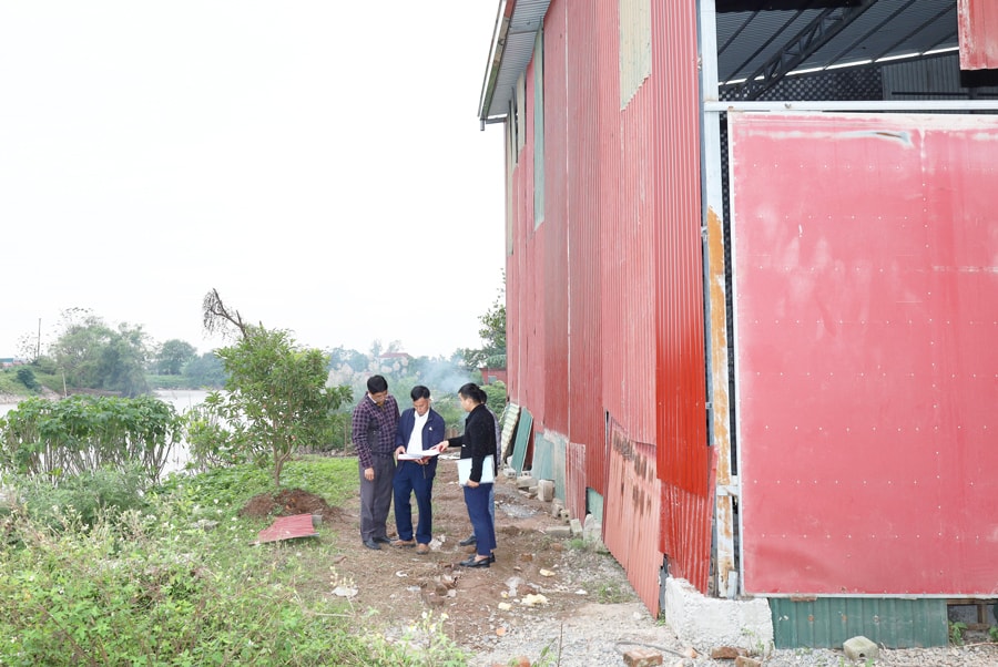 Lực lượng chức năng kiểm tra một nhà xưởng được xây dựng trong phạm vi bảo vệ công trình thủy lợi tại xã Đại Xuyên.