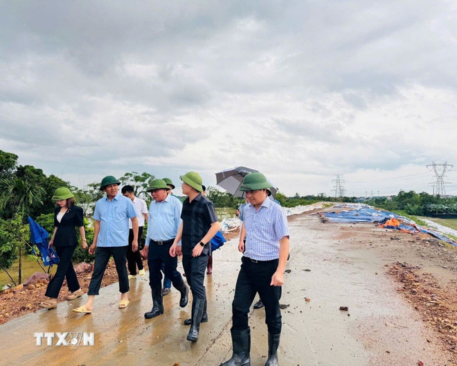 Phó Bí thư Thường trực Thành ủy Hà Nội Nguyễn Văn Phong kiểm tra thực tế trọng điểm xung yếu cấp thành phố tuyến đê hữu Cầu tại Km25+850 ở thôn Hòa Bình, xã Trung Giã. (Ảnh: Phương Anh/TTXVN)