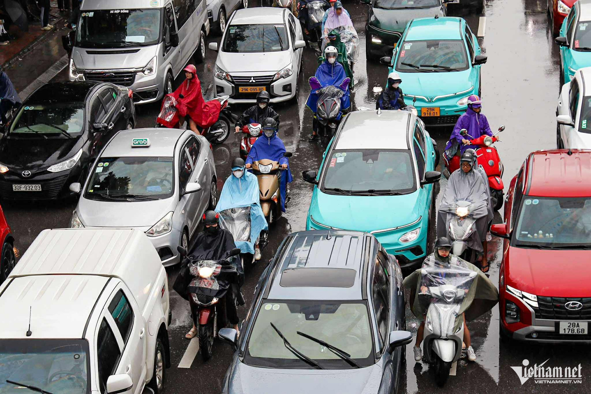 Nhiều người mệt mỏi khi gặp cảnh tắc đường trong thời tiết mưa nặng hạt.