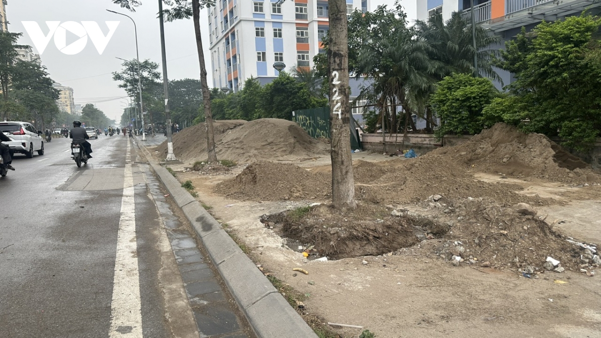 Ghi nhận tại tuyến phố Tân Mai, phường Hoàng Mai, nhiều hố cây trong tình trạng vữa bê tông phủ kín không được thu dọn, đẩy cây xanh vào trạng thái suy kiệt và tiềm ẩn nguy cơ nghiêng đổ.