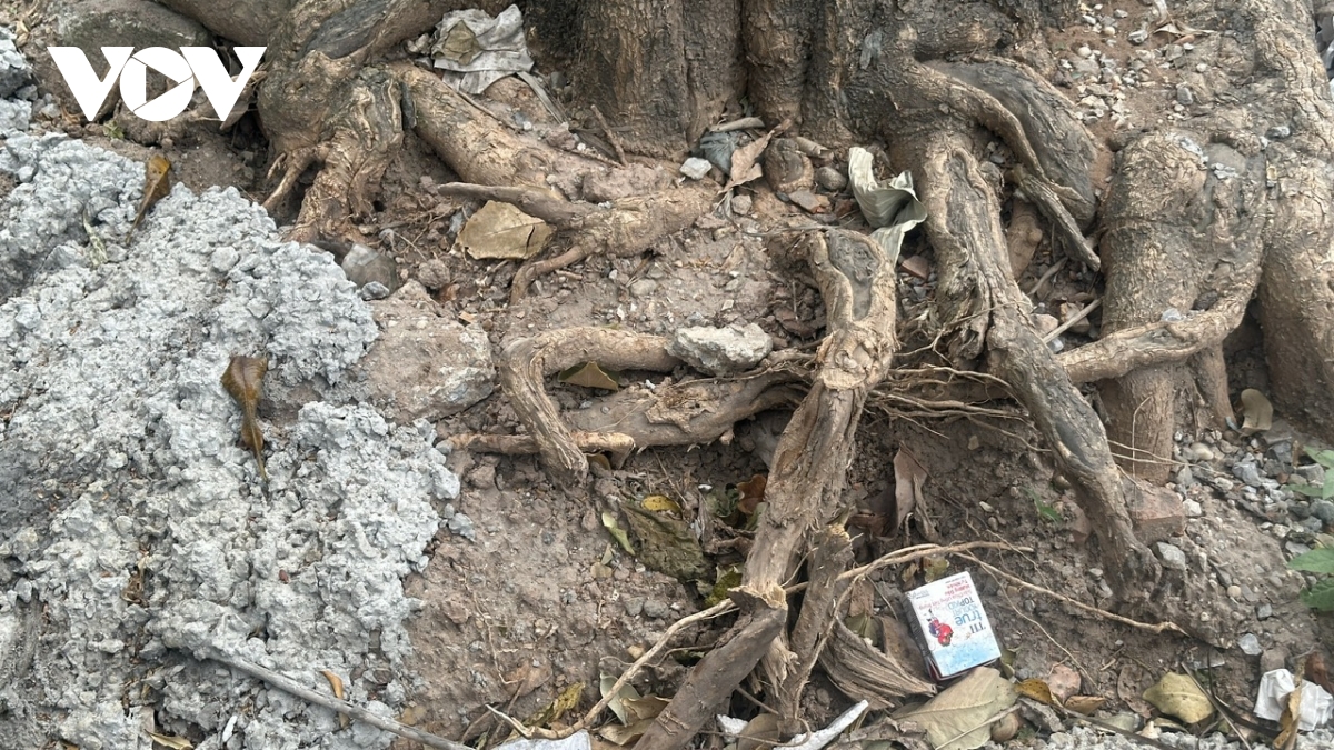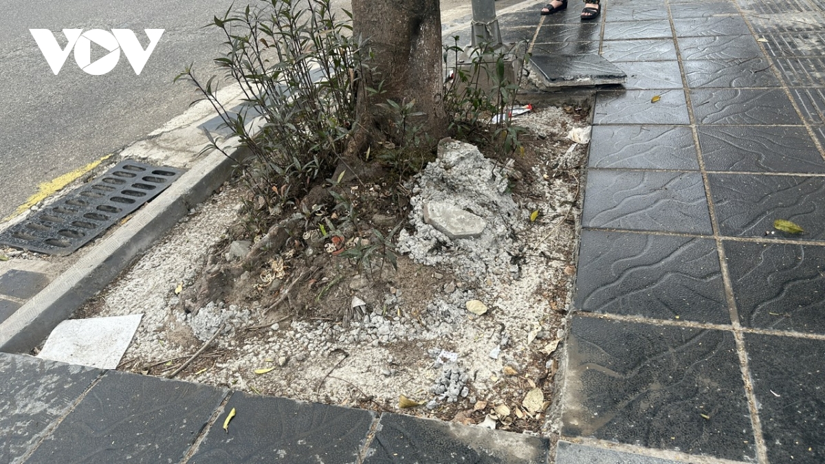 Gạch vỡ, xi măng và đất đá bị đổ vào hố cây, khiến cây bị “ngạt” và khó tiếp tục sinh trưởng.