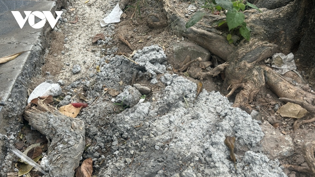 Bê tông thừa đổ tràn xuống hố, khiến rễ cây không còn không gian phát triển.