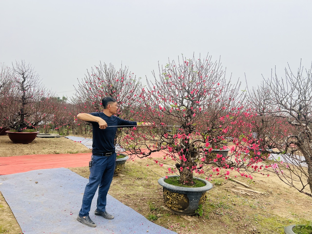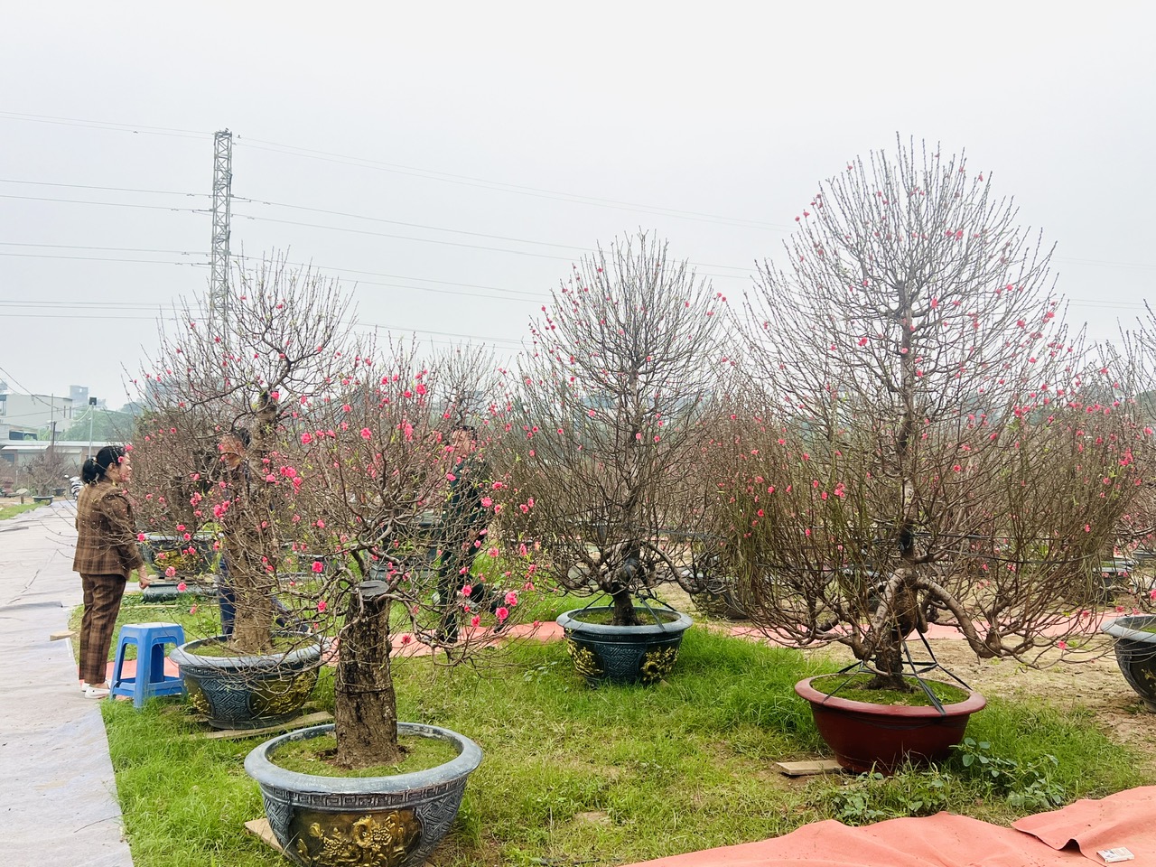 Các chủ vườn tất bật đón khách, kiểm tra kích thước từng chậu để tư vấn, báo giá cho phù hợp với nhu cầu của khách. Những gốc đào lớn, thế đẹp được chăm chút kĩ càng, bởi đây là dòng đào phục vụ biếu tặng, trang trí sảnh cơ quan, đơn vị, tòa nhà, có giá chục triệu đồng mỗi cây.