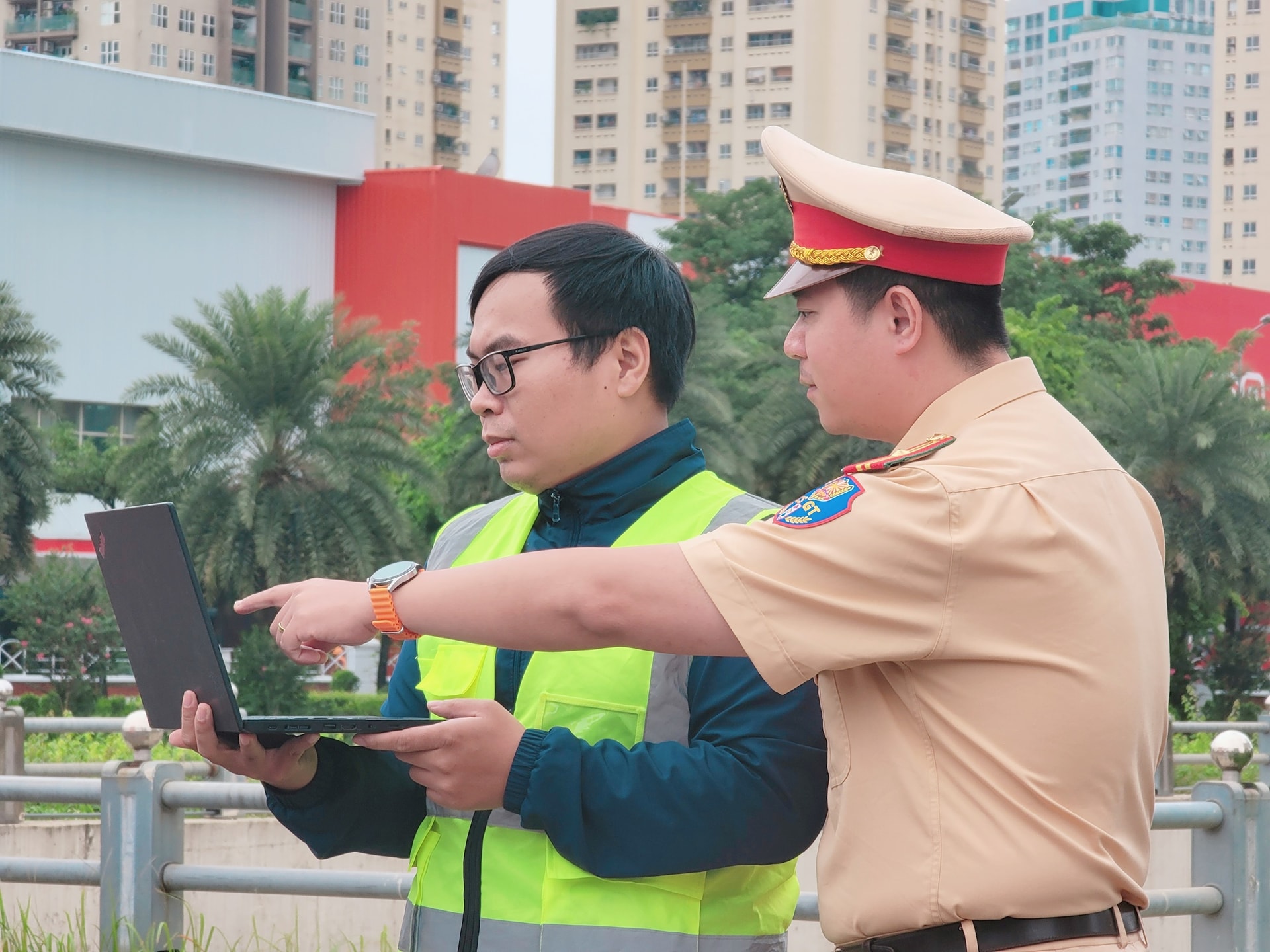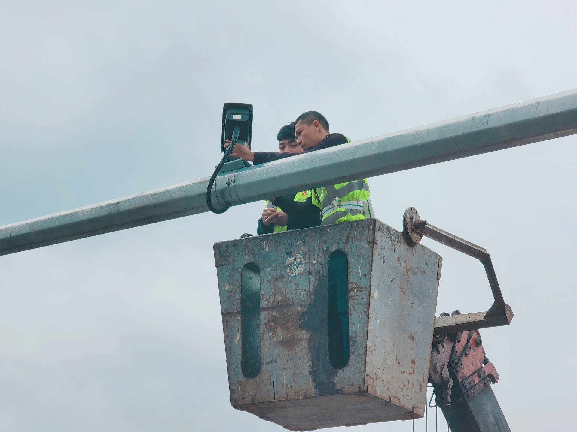 Lực lượng cảnh sát giao thông phối hợp cùng đội ngũ kỹ sư bảo đảm các yêu cầu kỹ thuật trong việc lắp đặt camera AI. Ảnh: MH