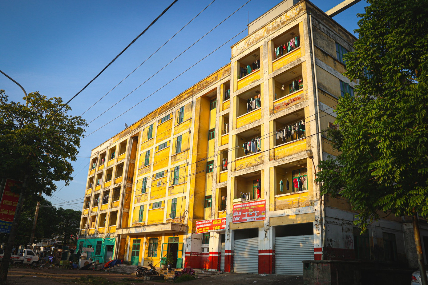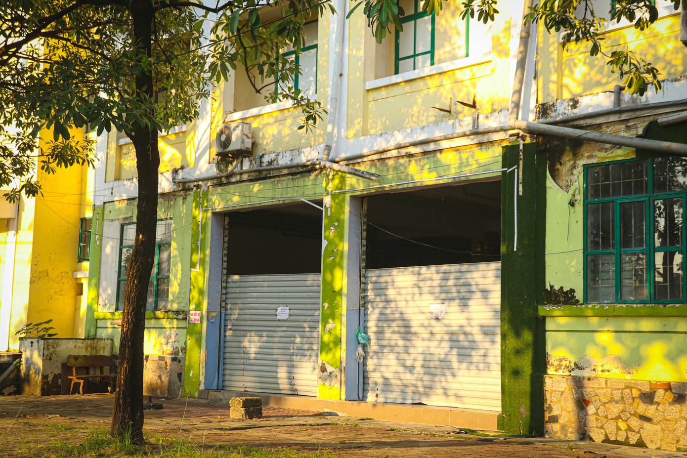 Hàng loạt kiốt đóng kín cửa, che chắn tạm bợ, nhếch nhác khu nhà ở dành cho công nhân.