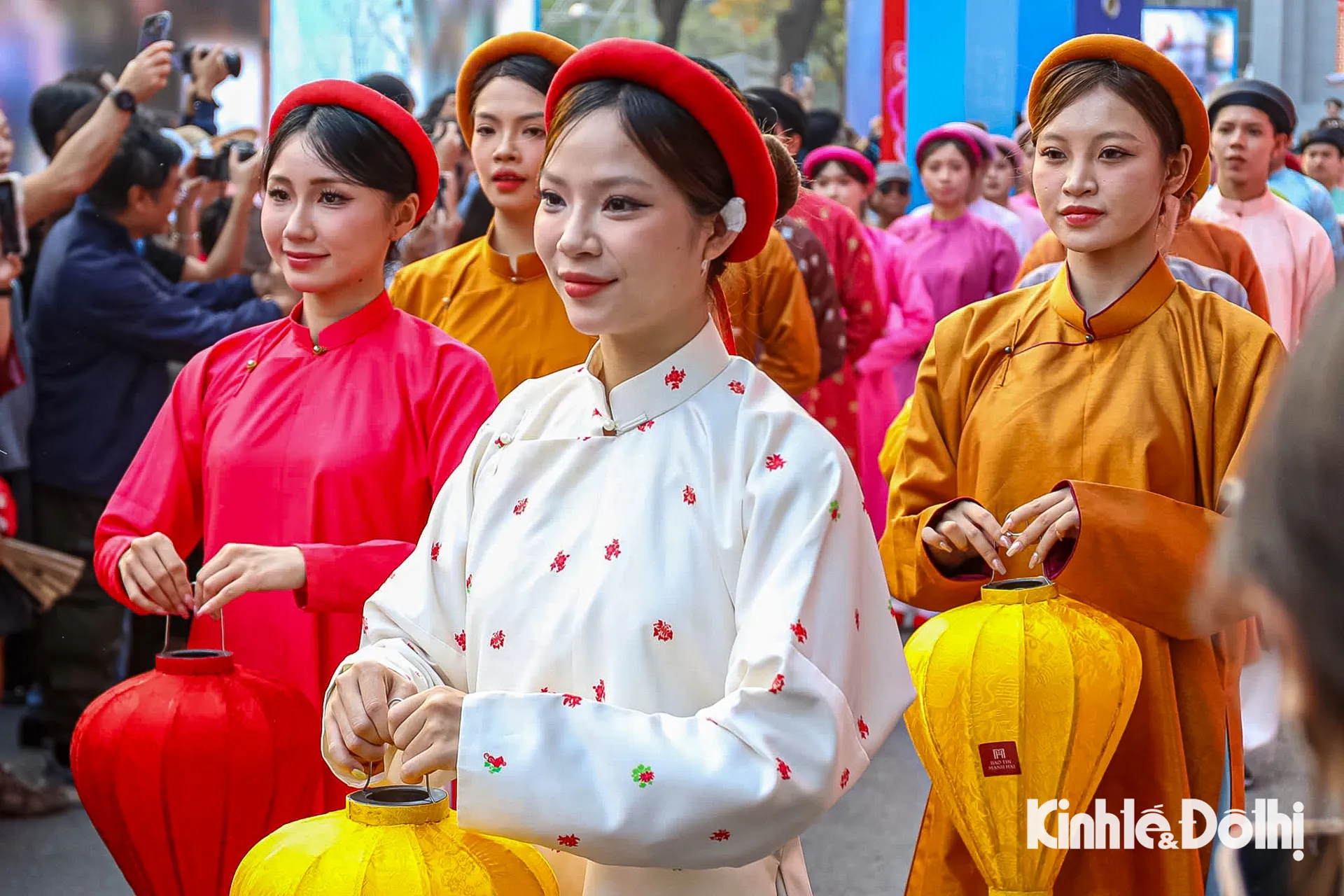 Đông đảo các bạn trẻ tham dự sự kiện áo dài hành bộ tại phố đi bộ hồ Gươm.