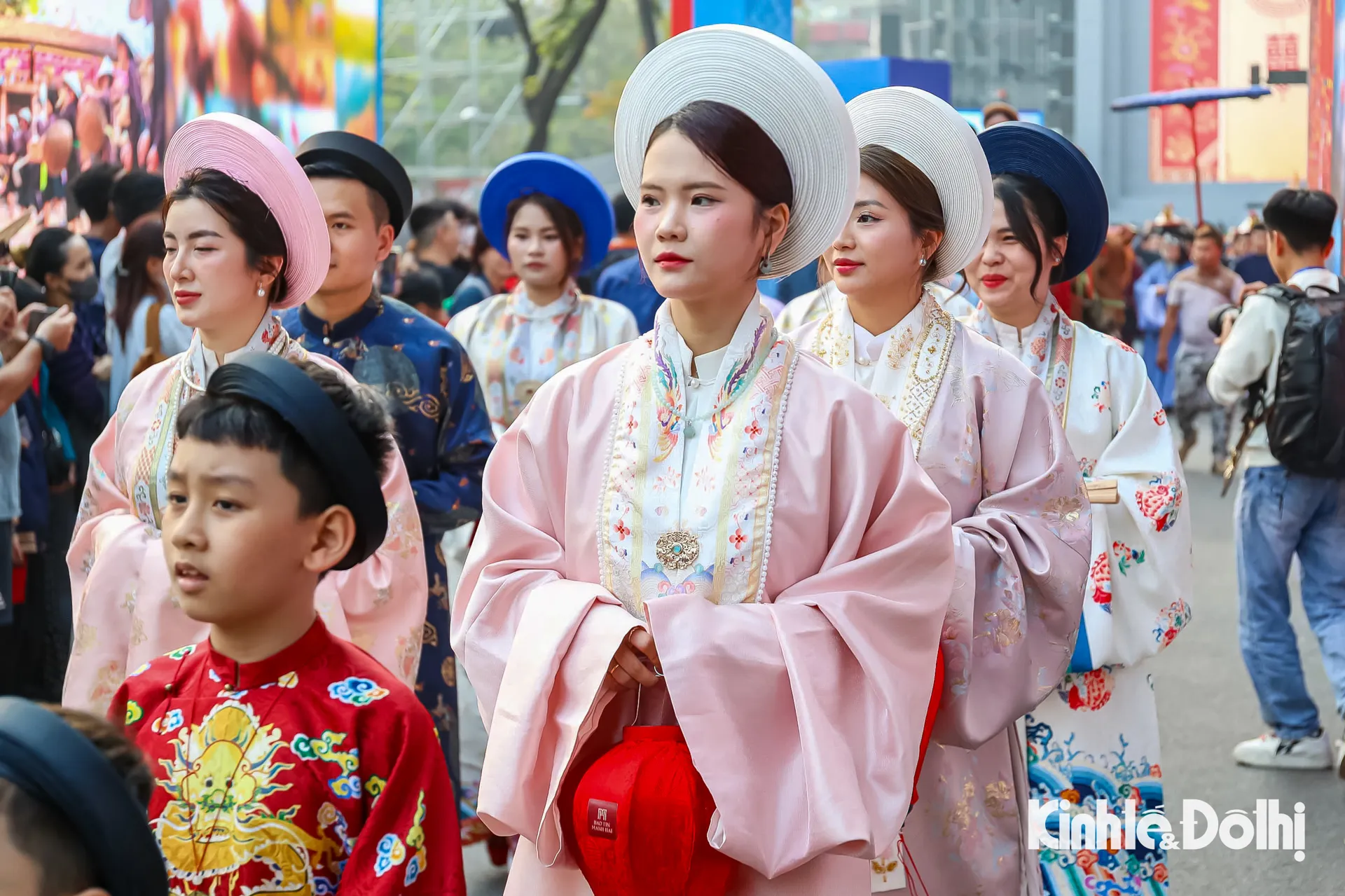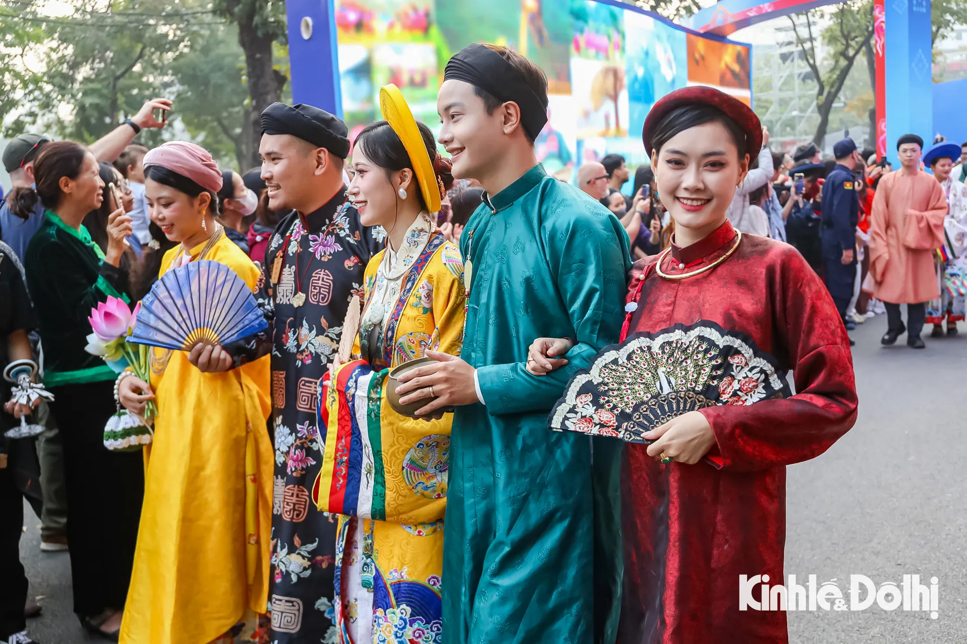 Chiều 7/12, phố đi bộ hồ Hoàn Kiếm thu hút sự chú ý khi khoảng 800 người trong Việt phục cùng xuất hiện để tái hiện một nghi lễ cưới truyền thống.