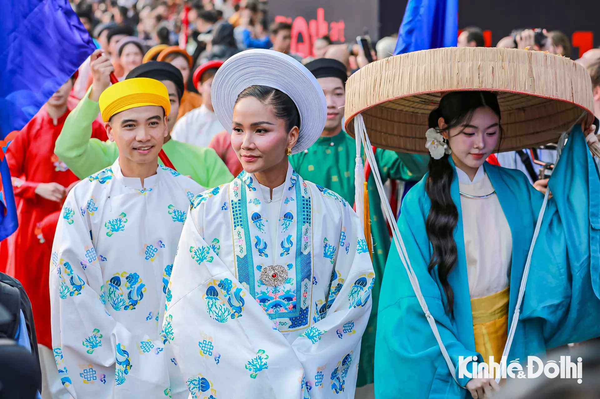 Từ màu sắc áo, kiểu dáng khăn vấn đến từng chi tiết của lễ phục hai họ đều được chăm chút, tạo nên lát cắt sinh động của đời sống Việt xưa giữa không gian hiện đại của Thủ đô Hà Nội.