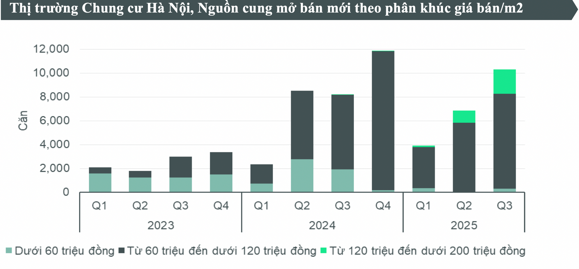Lũy kế 9 tháng năm 2025, tổng nguồn cung đạt gần 21.100 căn, tăng 10% so với cùng kỳ năm 2024. Đáng chú ý, quý III ghi nhận 2.000 căn hộ có giá chào bán trên 120 triệu đồng/m2, mức cao kỷ lục từ trước đến nay. Các dự án mở bán mới phân bổ đa dạng tại nhiều khu vực, trong đó nổi bật là khu vực có kết nối tốt như Tây Hồ, Cầu Giấy và Long Biên.