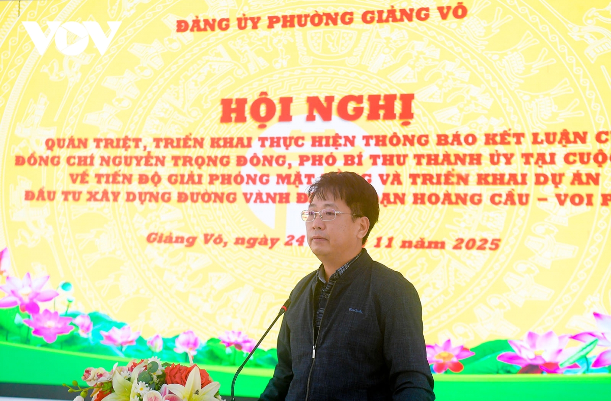Phó Chủ tịch UBND phường Giảng Võ Nguyễn Anh Dũng cho biết: "Phường Giảng Võ là địa bàn thuận lợi nhất mặc dù có khối lượng giải phóng mặt bằng lớn nhất đoạn Hoàng Cầu - Voi Phục của dự án đường Vành đai 1. Theo Thông báo kết luận, các phường phải hoàn thành phê duyệt toàn bộ phương án bồi thường, hỗ trợ, tái định cư còn lại trước ngày 30/11 và hoàn thành giải phóng mặt bằng toàn tuyến trước ngày 15/12/2025. Vì vậy, đề nghị các lực lượng, các tổ dân phố và đơn vị liên quan tiếp tục phối hợp chặt chẽ, kiên quyết hoàn thành công tác bàn giao mặt bằng trước hạn trên".