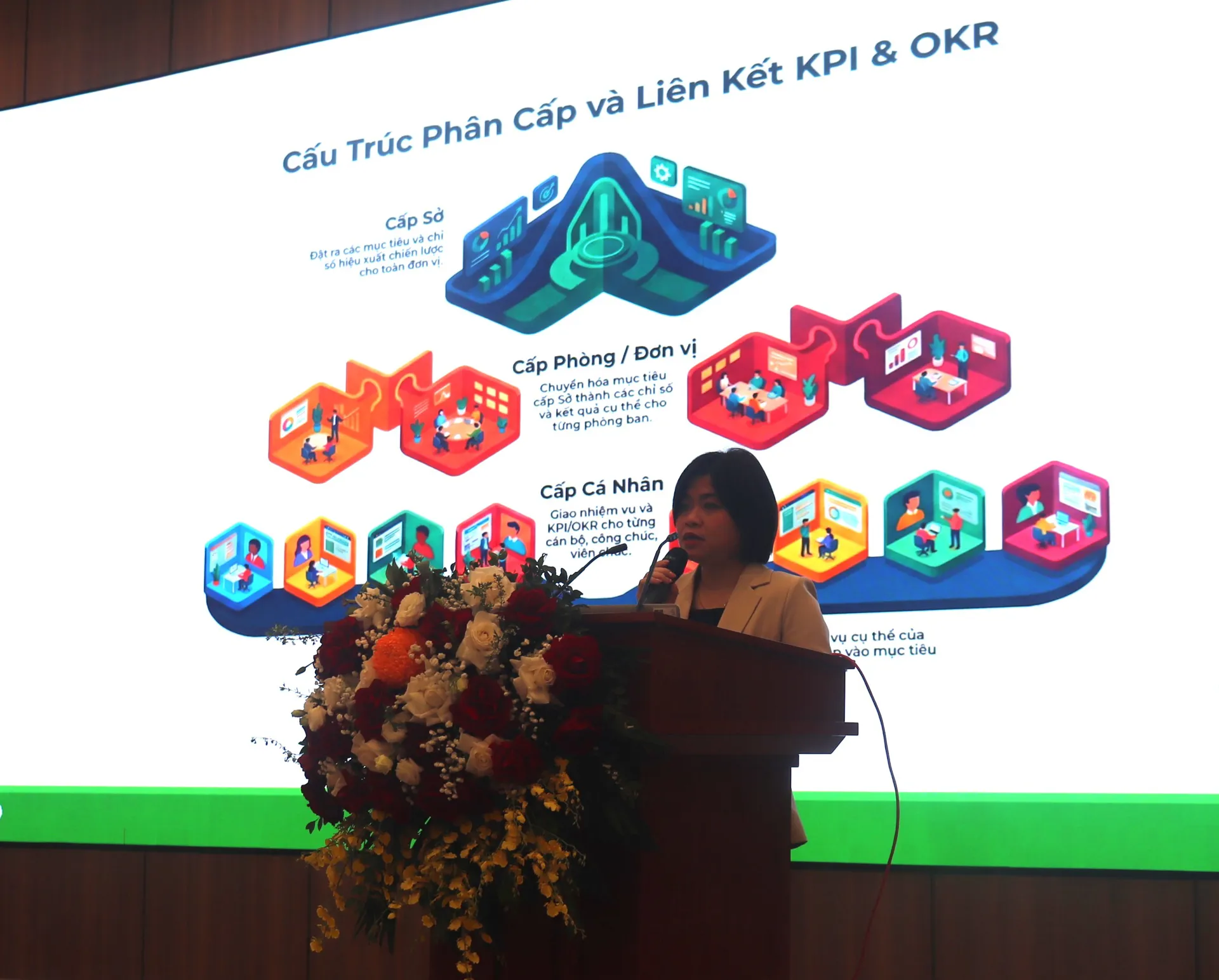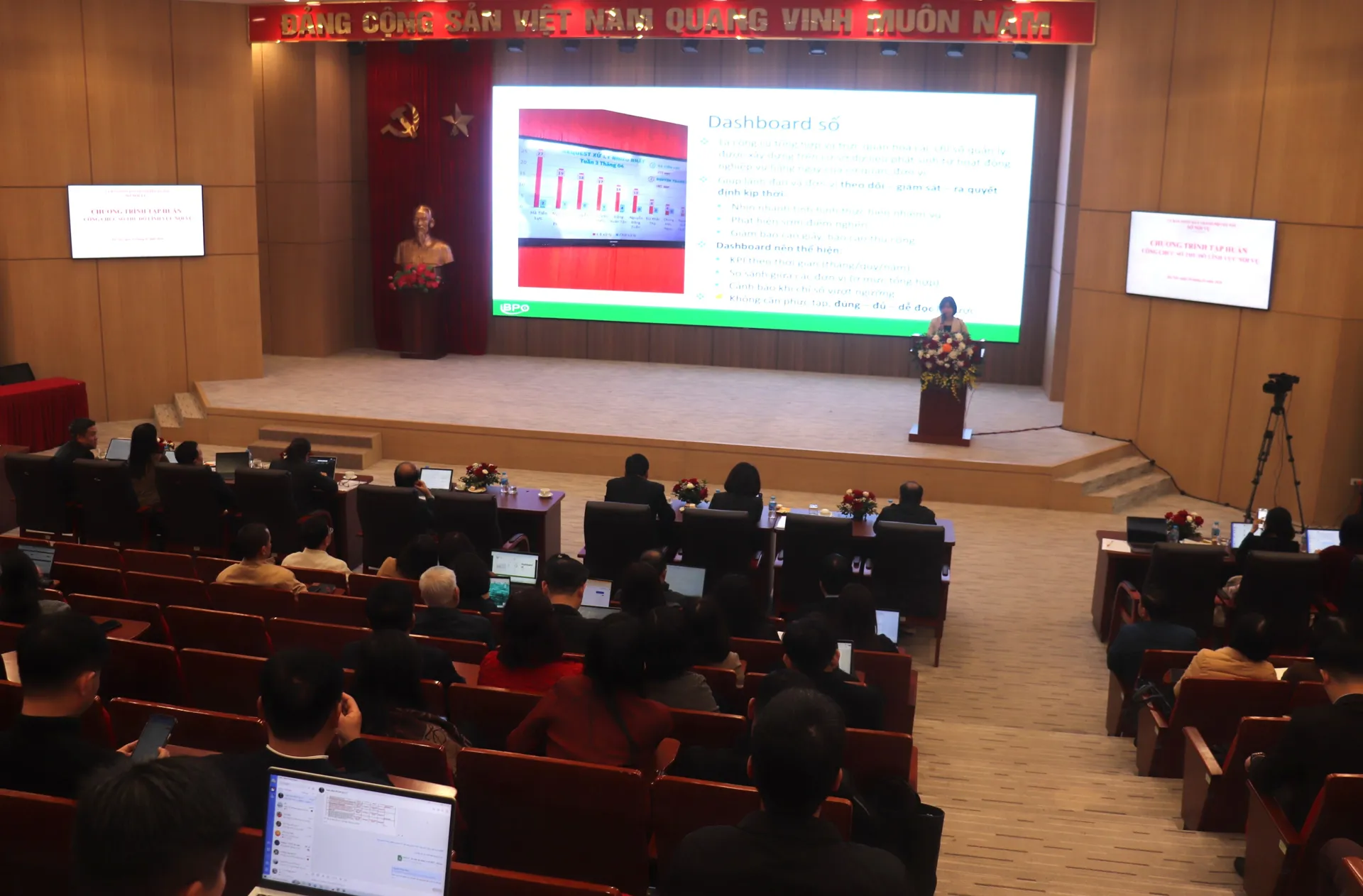 Chương trình tập huấn diễn ra trong thời gian 1 ngày, trong đó sáng nay, các đại biểu đã được Chuyên gia Bùi Thị Thanh Hương - iBPO giới thiệu tổng quan về AI - OKR - KPI và KPI - Dashboard số, đồng thời tiến hành khảo sát, đánh giá.