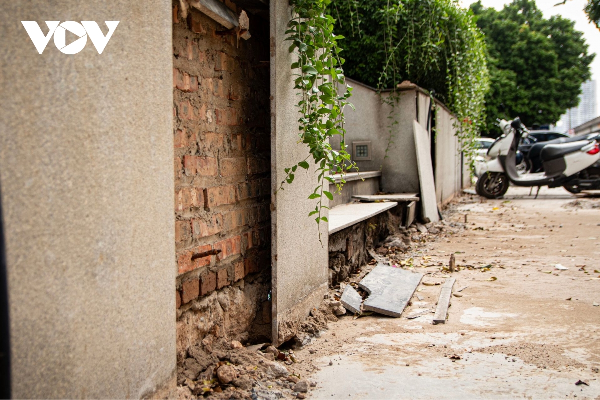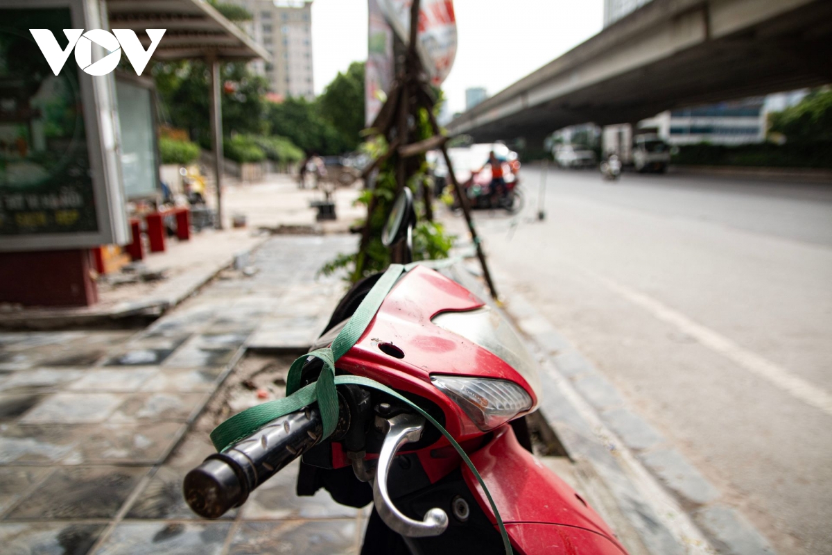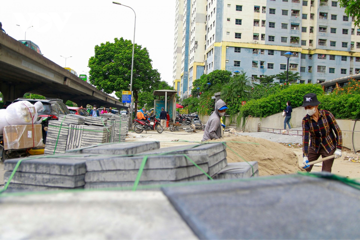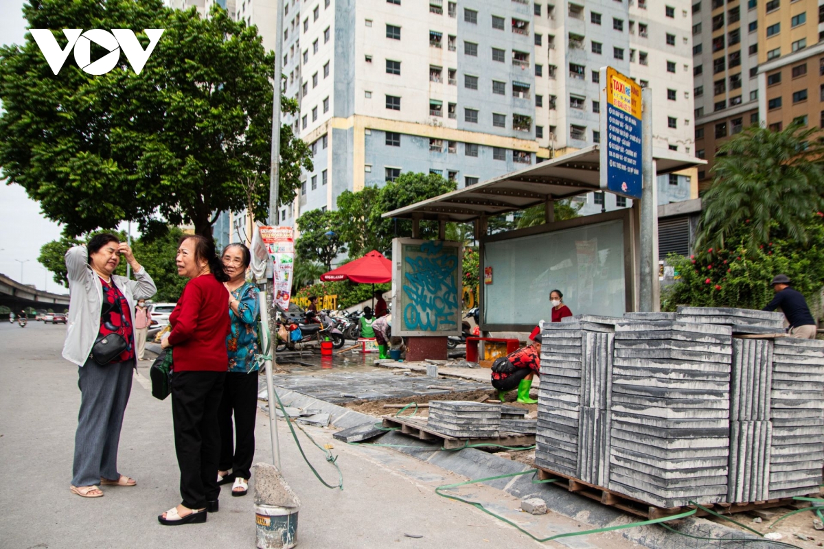 Khu vực nhà chờ xe buýt tại Khu đô thị Kim Văn – Kim Lũ, phường Hoàng Mai, nhiều người dân phải đứng dưới lòng đường để đón xe. Phần vỉa hè quanh nhà chờ đang được tu sửa, các đoạn rào chắn tạm bằng dây nứa thô sơ, những chồng gạch đá phục vụ cho công trình đang chiếm gần hết lối đi bộ, buộc người dân phải xuống lòng đường, tiềm ẩn nguy cơ mất an toàn giao thông.